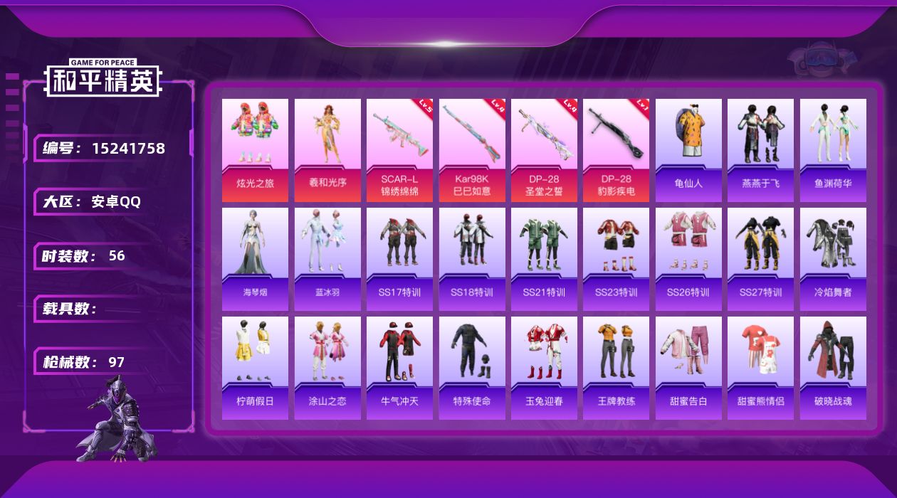 [15241758]【暑期末清货/特价急出/永久包赔/商品详情看图】:安卓 手Q-2粉装-4特效枪-2.3w热力值-2印记-56套装-97枪皮【特效枪等级】:SCAR-L-锦绣绵绵(五级),Kar98K-巳巳如意(四级),DP-28-圣堂之誓(四级),DP-28-豹影疾电(一级)【优质套装】:粉装-炫光之旅,角色-羲和光序