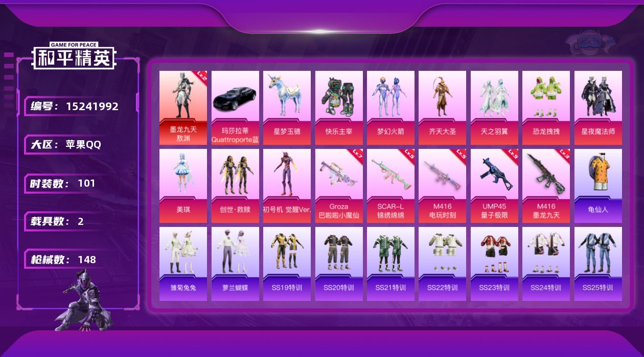 [15241992]【暑期末清货/特价急出/永久包赔】:苹果 手Q-1红装-9粉装-5特效枪-2载具-5w热力值-7印记-101套装-148枪皮【角色神装等级】:墨龙九天-敖渊(二级)【稀有载具】:玛莎拉蒂Quattroporte(夜幕蓝),星梦玉骢【特效枪等级】:SCAR-L-锦绣绵绵(五级),M416-电玩时刻(五级),M416-墨龙九天(三级),GROZA-巴啦啦小魔仙(七级),UMP45-量子极限(五级)【优质套装】:粉装-快乐主宰,粉装-梦幻火箭,粉装-齐天大圣,粉装-天之羽翼,粉装-恐龙拽拽,粉装-星夜魔法师,角色-美琪,套装-创世·救赎,角色-初号机 觉醒Ver.【优质飞行器】:龙翔九天飞行器,冠军兔兔飞行器,曦光华影飞行器