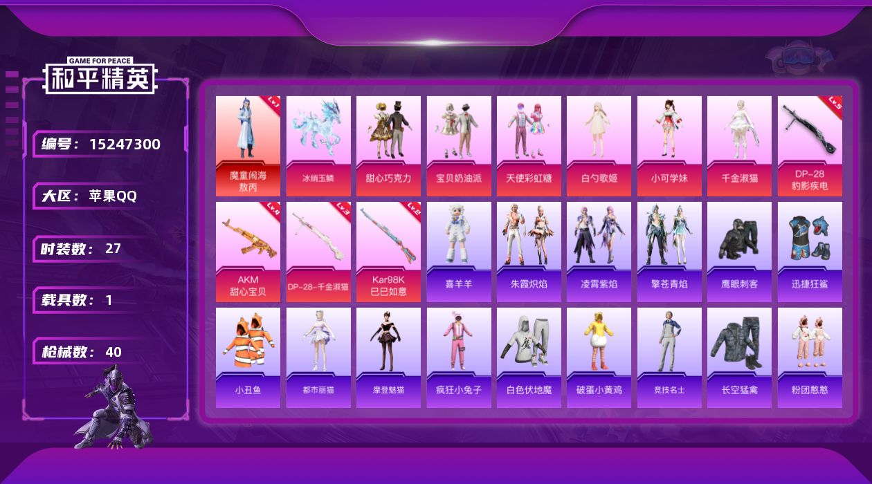 [15247300]【特价急出/详情看图】:苹果 手Q-1神装-6粉装-4特效枪-1载具-3粉色飞行器-1.5w热力值-1王牌印记-27套装-40枪皮【红色神装等级】:魔童闹海-敖丙(一级)【热门品类】:套装-小丑鱼【粉色载具】:冰绡玉鳞【粉色套装】:粉装-甜心巧克力,粉装-宝贝奶油派,粉装-天使彩虹糖,角色-白勺歌姬,角色-小可学妹,角色-千金淑猫【粉色枪皮等级】:AKM-甜心宝贝(四级),Kar98K-巳巳如意(二级),DP-28-千金淑猫(三级),DP-28-豹影疾电(五级)【粉色飞行器】:飞天猪飞行器,灵珠游龙飞行器
