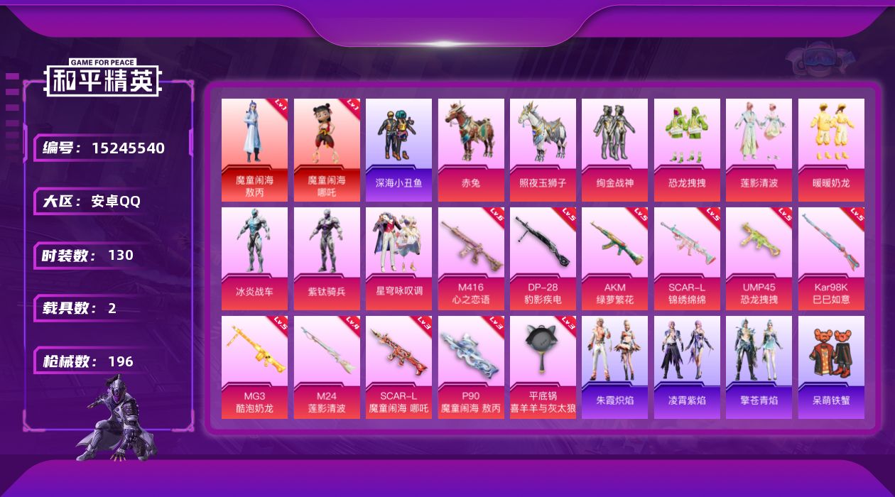 [15245540]素材身法号/地铁满天赋【特价急出/详情看图】:安卓 手Q-2神装-7粉装-11特效枪-2载具-4粉色飞行器-6.7w热力值-11王牌印记-130套装-196枪皮【红色神装等级】:魔童闹海-敖丙(一级),魔童闹海-哪吒(一级)【热门品类】:套装-深海小丑鱼,角色-忠猛周仓,角色-忠真马岱,角色-忠义严颜,套装-龟仙人,角色-8号机,大砍刀-青龙偃月刀,撬棍-龙胆亮银枪【粉色载具】:赤兔,照夜玉狮子【粉色套装】:粉装-绚金战神,粉装-恐龙拽拽,粉装-莲影清波,粉装-暖暖奶龙,角色-冰炎战车,角色-紫钛骑兵,粉装-星穹咏叹调【粉色枪皮等级】:AKM-绿萝繁花(五级),SCAR-L-锦绣绵绵(五级),SCAR-L-魔童闹海 哪吒(三级),M416-心之恋语(六级),UMP45-恐龙拽拽(五级),P90-魔童闹海 敖丙(三级),Kar98K-巳巳如意(五级),M24-莲影清波(四级),DP-28-豹影疾电(五级),MG3-酷泡奶龙(五级),平底锅-喜羊羊与灰太狼(三级)【粉色飞行器】:熔岩统帅飞行器,沙丘之主天马,灵珠游龙飞行器