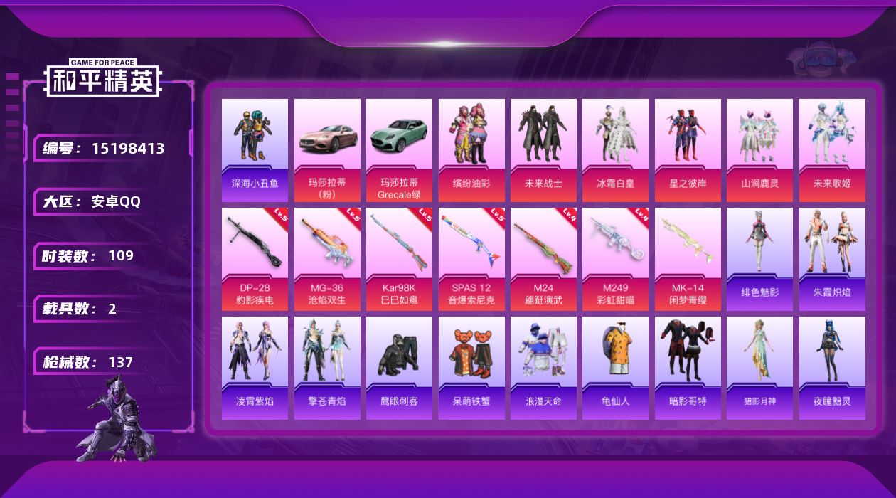[15198413]【店主推荐捡漏号!可直接换绑】/素材身法号/扭蛋碎片531/地铁满天赋 安卓 手Q-6粉装-7特效枪-2载具-1粉色飞行器-4.6w热力值-8王牌印记-109套装-137枪皮【热门品类】:粉装-缤纷油彩,套装-浪漫天命,套装-深海小丑鱼,套装-龟仙人,套装-暗影哥特【粉色载具】:玛莎拉蒂Ghibli(粉),玛莎拉蒂Grecale(薄荷绿)【粉色套装】:粉装-未来战士,粉装-缤纷油彩,粉装-冰霜白皇,粉装-星之彼岸,粉装-山涧鹿灵,粉装-未来歌姬【粉色枪皮等级】:Kar98K-巳巳如意(五级),M24-翩跹演武(四级),SPAS-12-音爆索尼克(五级),M249-彩虹甜喵(四级),DP-28-豹影疾电(五级),MG-36-沧焰双生(五级)