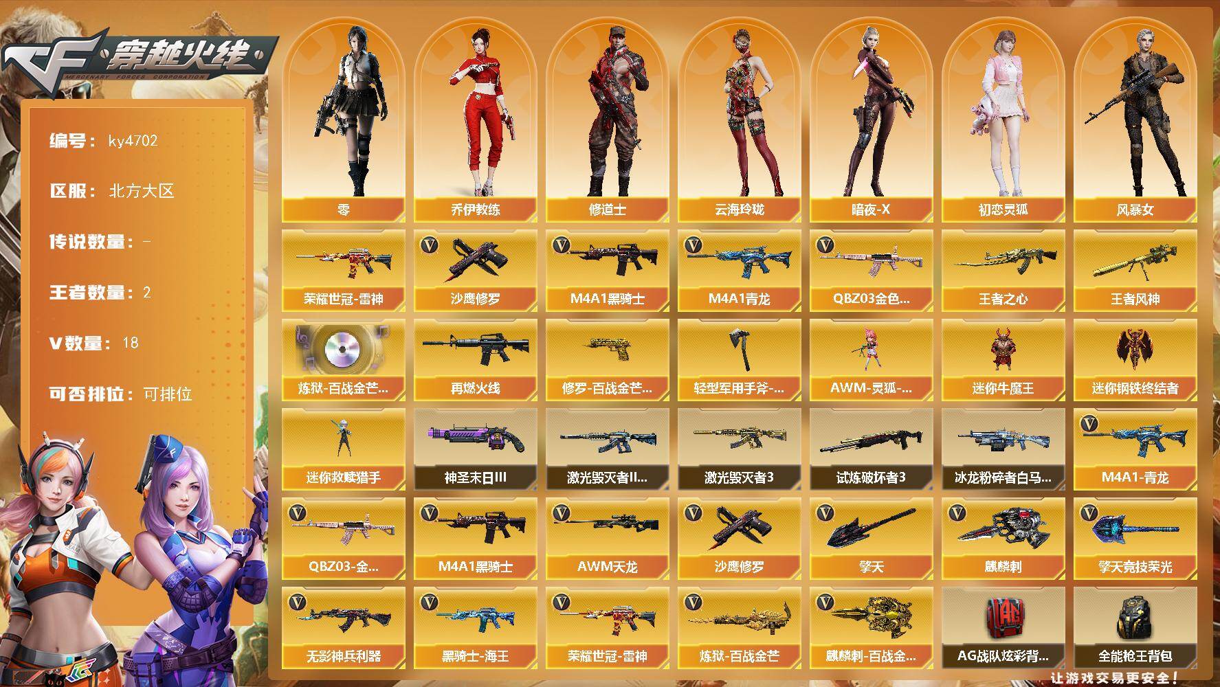 - [12615441]四川一区-64V-11王者-0炫金 【传说武器】:传说辉光 【传说角色】:传说女帝 【热门武器】:传说辉光,QBZ03-金色蔷薇,Scar Light-白虎,M200-幻神,M200-竞技荣光,荣耀世冠-雷神,柯尔特-冠军之特,M4A1-黑骑士,汤姆逊-烈龙*6,RPK-盘龙*6,加特林-炼狱,斯泰尔-蝴蝶,USP-雷暴,沙鹰-修罗,荣耀世冠-龙啸*2,金刚伞 【王者炫金武器】:王者之魄 【音效卡】:AK47-火麒麟音效卡,M4A1-黑骑士音效卡,Barrett-毁灭音效卡,QBZ03-金色蔷薇音效卡 【稀有皮肤】:幻神-AG-CFPLS17冠军,幻神-巅峰荣耀,雷神-荣耀之魄,雷神-虎将,火麒麟-平天大圣,火麒麟-荣耀世冠AG,毁灭耀金皮肤,毁灭-黑大圣皮肤 【角色】:传说女帝,灵狐者-职业经理,幽,电竞教官-云悠悠 【人偶武器】:斯泰尔-蝴蝶,巴雷特-零-水下丽影,COP-旗袍*3,迷你生化手雷,深渊终结者手雷 【暴走生化】:斯泰尔-蝴蝶 【挑战大师】:VEPR-12-金魔*2,冰龙粉碎者-白马银枪 【英雄级武器】:M200-竞技荣光,柯尔特-竞技荣光,擎天-竞技荣光,高爆手雷-竞技荣光,烟雾弹-竞技荣光,闪光弹-竞技荣光,幻灵之锋,破空枪刃-夜魔,马来剑-夜魔,麒麟刺-堕天神*2,龙啸-堕天神,USP-雷暴,荣耀世冠-雷神,荣耀世冠-龙啸*2,QBZ03-金色蔷薇,Scar Light-白虎,M4A1-雷神,M4A1-黑骑士,RPK-盘龙*6,加特林-炼狱,汤姆逊-烈龙*6,AK47-火麒麟,Barrett-毁灭,Barrett-极光,M200-幻神,M4A1-赤狱骑士,柯尔特-冠军之特,沙鹰-天神,沙鹰-修罗,龙啸 【特殊枪械】:蝴蝶斯泰尔+6烈龙,1白虎,1黑骑士,6烈龙,6盘龙,1炼狱,1蝴蝶斯泰尔