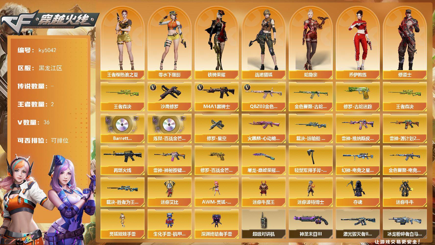 [16067367]黑龙江区-36V-2王者-0炫金 【热门武器】:王者森决,QBZ03-金色蔷薇,金色蔷薇-古蛇迷踪,修罗-古蛇迷踪,M4A1-黑骑士,沙鹰-修罗 【王者炫金武器】:王者森决 【音效卡】:Barrett-碧霄极光音效卡*2,炼狱-百战金芒-庆典舞曲音效卡 【皮肤】:幻神-电竞之星 皮肤,金色蔷薇-电竞之星 皮肤,裁决-运输船 皮肤,裁决-胜者为王 皮肤,雷神-维纳斯皮肤,雷神-源计划2.0专属 皮肤,M4A1-再燃火线,雷神-神秘按键 皮肤,火麒麟-心动糖果,修罗-星空,修罗-百战金芒 皮肤,屠龙-巅峰荣耀 皮肤,轻型军用手斧-再燃火线 【角色】:战地猎狐,王者樱-热浪之夏,蛇隐宗,奇洋探员,乔伊教练,修道士,云海玲珑,暗夜-X,初恋灵狐,芳心审判者,飞虎队-X,风暴女*2,嘉年华灵狐,荆棘玫瑰,兰-海滩派对,兰-新年限定,零-水下丽影,灵狐者-X,麻雀,萌儿,潘多拉-X,潘多拉-甜心教官,蛇姬,斯沃特-X,铁骑荣耀,维纳斯,雪莉杨-摸金校尉 【人偶武器】:AWM-灵狐-15周年嘉年华*3,迷你牛魔王,迷你波特博士,夺魂,迷你牛牛,生化手雷-机甲核心*2,深渊终结者手雷,迷你艾比,灵狐娃娃手雷 【暴走生化】:超级对讲机 【挑战大师】:冰龙粉碎者-白马银枪,激光毁灭者III-白马银枪,神圣爆裂者-末日III,惩戒者III 【英雄级武器】:AK47-火麒麟,M4A1-雷神*2,M4A1-黑骑士,无影-神兵利器,黑武士-锦绣游龙,超新星-热带奇洋,金色蔷薇-古蛇迷踪,QBZ03-金色蔷薇,烈火-动感闪耀,黑骑士-海王,Barrett-毁灭,炼狱-百战金芒,烈龙-云海游龙,沙鹰-修罗,柯尔特-电竞之星,天神-动感闪耀,修罗-古蛇迷踪,屠龙,擎天,屠龙-动感闪耀,擎天-云海游龙,龙啸-热带奇洋,麒麟刺-百战金芒,手雷-动感闪耀,手雷-云海游龙,手雷-热带奇洋,高爆手雷-古蛇迷踪,烟雾弹-幻灵,烟雾弹-古蛇迷踪,M4A1-赤狱骑士,M4A1-苍鸣雷神,Barrett-碧霄极光*2 【道具】:BS战队炫彩背包,CFS限定背包,云山科技背包,云海游龙炫彩背包,亚洲杯纪念炫彩背包,全能枪王背包,古蛇迷踪炫彩背包,奇洋探员-海龟背包,热带奇洋炫彩背包,百战金芒炫彩背包,虎牙炫彩背包,超级背包,哔哩哔哩名片,女皇终结者-魔龙之吻,救世主-黑桃战神,黄金生化钩,绿色巨人,灵魂忍者*2,变异