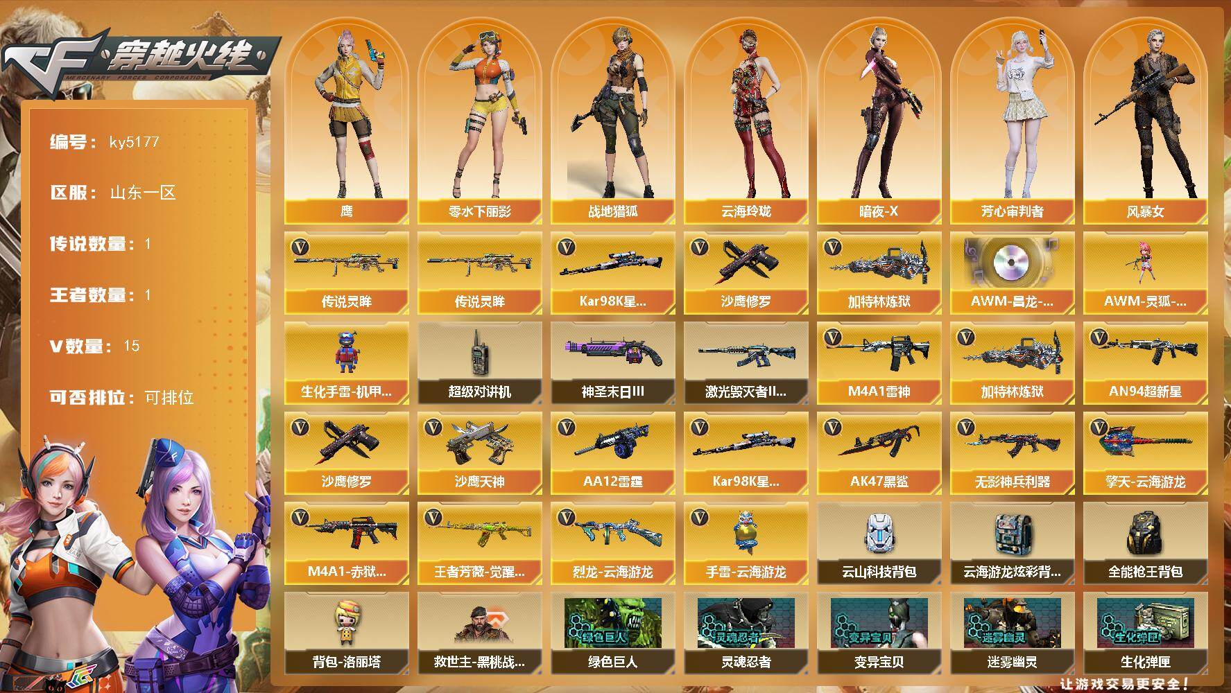 [16085004]山东一区-15V-1王者-0炫金 【传说武器】:传说灵眸 【热门武器】:传说灵眸,Kar98K-星神,加特林-炼狱,沙鹰-修罗*2 【音效卡】:AWM-昌龙-怀旧音效卡 【角色】:鹰,战地猎狐,云海玲珑,暗夜-X,芳心审判者,风暴女,嘉年华灵狐,零-水下丽影 【人偶武器】:AWM-灵狐-15周年嘉年华,生化手雷-机甲核心 【暴走生化】:超级对讲机 【挑战大师】:激光毁灭者III-白马银枪,神圣爆裂者-末日III 【英雄级武器】:M4A1-雷神,AN94-超新星,AK47-黑鲨,无影-神兵利器,王者芳薇-觉醒版,Kar98K-星神,加特林-炼狱,烈龙-云海游龙,AA-12-雷霆,沙鹰-修罗*2,沙鹰-天神,擎天-云海游龙,手雷-云海游龙,M4A1-赤狱骑士 【道具】:云山科技背包,云海游龙炫彩背包,全能枪王背包,背包-洛丽塔,救世主-黑桃战神,黄金生化钩,绿色巨人,灵魂忍者,变异宝贝,迷雾幽灵,生化弹匣,夺命之镰,防化服*3,金色流光-枪王排位*2,星辰流光-枪王排位,枪王排位28赛季金色流光,语音特效-生化,云海游龙表情,防弹头盔*4,防弹衣*4,C4工具钳*4,手雷包*4 【特殊枪械】:1炼狱