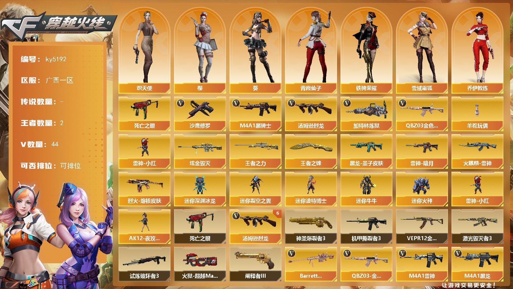 [16087129]广西一区-44V-2王者-1炫金 【热门武器】:QBZ03-金色蔷薇,死亡之眼,M4A1-黑骑士,汤姆逊-烈龙*6,加特林-炼狱,羊驼玩偶,雷神-小红,沙鹰-修罗*3 【王者炫金武器】:王者之力,王者之锋,炫金毁灭 【皮肤】:雷神-暗月,火麒麟-雷神,黑龙-墨子皮肤,烈火-熔核皮肤 【角色】:葵,樱,雪域霜狐,奇洋探员,乔伊教练,云海玲珑,炽天使,初恋灵狐,电竞少女,飞虎队-X,风暴女,0号玩家,女战神,潘多拉-甜心教官,潜龙队-X,青霞仙子,铁骑荣耀,兔囡囡,雪莉杨,樱-战斗天使 【人偶武器】:雷神-小红,迷你深渊冰龙,迷你裂空之翼*2,迷你波特博士,迷你牛牛,迷你火种*3,AK12-夜玫瑰 【暴走生化】:死亡之眼 【挑战大师】:火狱乱世-超越Max,神圣爆裂者III,VEPR-12-金魔,激光毁灭者III,机甲撕裂者III,试炼破坏者III,阐释者III*2 【英雄级武器】:M4A1-千变,M4A1-黑龙,M4A1-雷神,M4A1-黑骑士,M4A1-死神,AK47-黑武士,AN94-超新星,黑武士-锦绣游龙,超新星-热带奇洋,M4A1-玫瑰精灵,QBZ03-金色蔷薇,Barrett-毁灭,Barrett-金色蔷薇,加特林-炼狱,汤姆逊-烈龙*6,AA-12-雷霆,沙鹰-修罗*3,沙鹰-天神,屠龙*2,擎天,麒麟刺,龙啸-热带奇洋,高爆手雷-竞技荣光,高爆手雷-云龙,手雷-热带奇洋,闪光弹-竞技荣光*3,烟雾弹-竞技荣光*3,烟雾弹-云龙,M4A1-赤狱骑士 【道具】:冰冰企鹅背包,奇洋探员-海龟背包,战舰背包,机械魔影背包-红色,炫彩背包,热带奇洋炫彩背包,超级背包,女皇终结者-魔龙之吻,救世主-黑桃战神,绿色巨人,灵魂忍者,变异宝贝,迷雾幽灵*2,生化弹匣,夺命之镰,防化服*2,星辰流光-枪王排位,流光-鎏金之域,枪王排位28赛季金色流光,枪王排位29赛季金色流光,热带奇洋表情,云海游龙表情,EP战队收纳包,防弹头盔*6,防弹衣*6,C4工具钳*2,手雷包*2 【特殊枪械】:1黑骑士,6烈龙,1炼狱