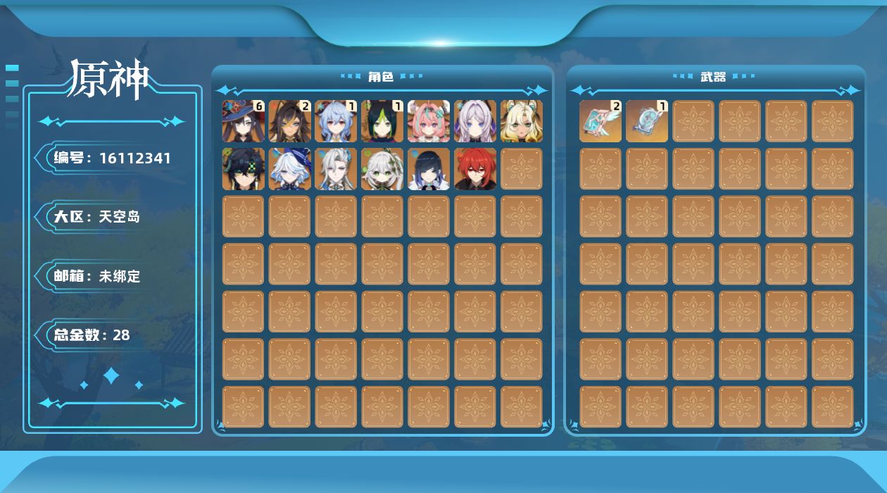 0命芙宁娜,0命那维莱特,2命迪希雅,0命纳西妲,1命提纳里,0命夜兰,1命甘雨,满命莫娜,0命迪卢克,0命基尼奇,0命希诺宁,0命茜特菈莉,0命瓦雷莎,0命丝柯克,0命菈乌玛,精1四风原典,精2天空之卷
