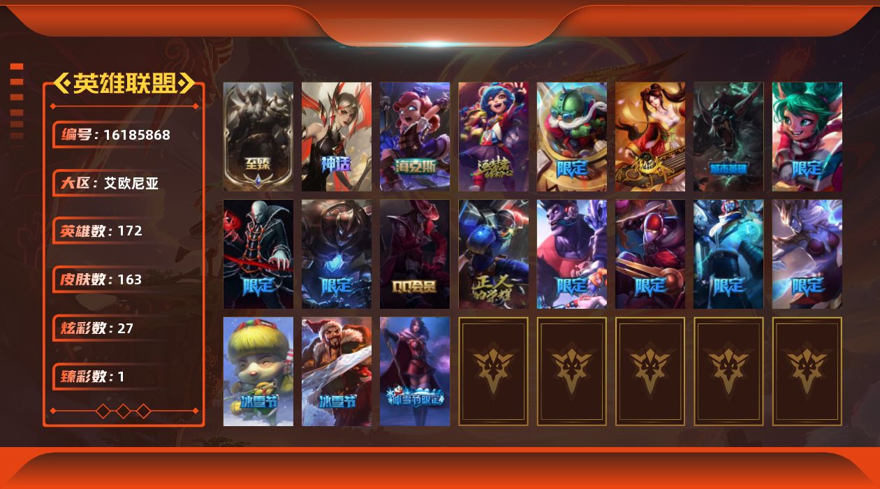 [16185868]青铜段位-172英雄-163皮肤-27炫彩-0终极-4神话-18限定-13传说-46史诗