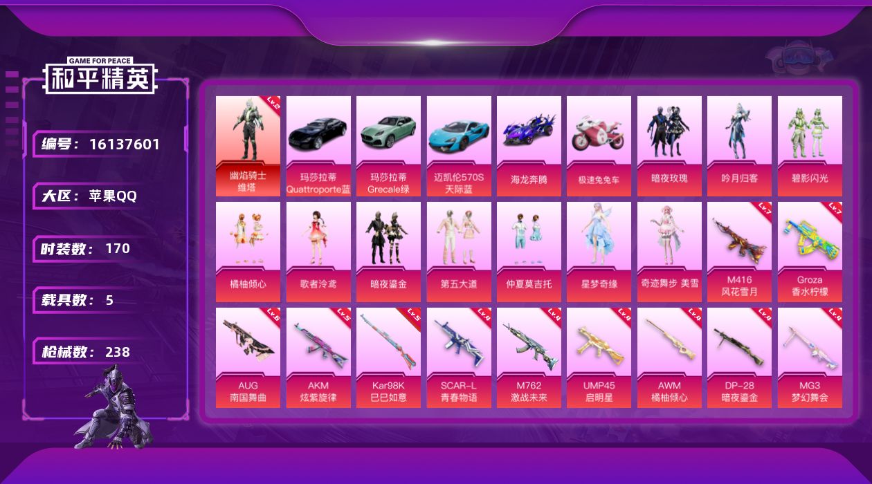 [16137601]地铁满天赋苹果 手Q-1神装-11粉装-13特效枪-5载具-7粉色飞行器-90608热力值-14王牌印记-170套装-238枪皮【红色神装等级】:幽焰骑士-维塔(二级)【红色角色神装】:幽焰骑士-维塔【热门品类】:套装-浪漫天命,套装-龟仙人,套装-暗影哥特,套装-粉红小猪【粉色套装】:粉装-暗夜玫瑰,粉装-吟月归客,粉装-碧影闪光,粉装-橘柚倾心,角色-歌者泠鸢,粉装-暗夜鎏金,粉装-第五大道,粉装-仲夏莫吉托,角色-星梦奇缘,角色-奇迹舞步 美雪【粉色枪皮等级】:AKM-炫紫旋律(五级),AKM-幽焰骑士(三级),SCAR-L-青春物语(四级),M416-风花雪月(七级),GROZA-香水柠檬(七级),AUG-南国舞曲(六级),M762-激战未来(四级),UMP45-启明星(四级),Kar98K-巳巳如意(五级),AWM-橘柚倾心(四级),DP-28-暗夜鎏金(四级),MG3-梦幻舞会(四级),平底锅-仲夏莫吉托(二级)【粉色载具】:玛莎拉蒂Quattroporte(夜幕蓝),玛莎拉蒂Grecale(薄荷绿),迈凯伦570S(天际蓝),海龙奔腾,极速兔兔车,僚机-萌兔起飞【粉色枪皮】:AKM-炫紫旋律,AKM-幽焰骑士,SCAR-L-青春物语,M416-风花雪月,GROZA-香水柠檬,AUG-南国舞曲,M762-激战未来,UMP45-启明星,Kar98K-巳巳如意,AWM-橘柚倾心,DP-28-暗夜鎏金,MG3-梦幻舞会,平底锅-仲夏莫吉托【粉色飞行器】:伏魔团飞行器,梦幻舞会飞行器,萌物绒绒飞行器,镜域双华-灵镜之阶,幽焰列车飞行器,凤舞九天飞行器