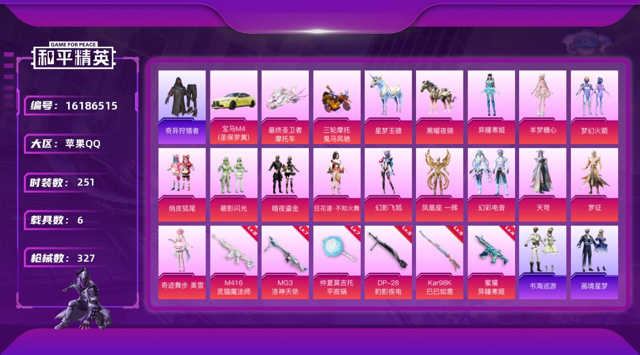 [16186515]苹果 手Q-1神装-14粉装-9特效枪-6载具-8粉色飞行器-124974热力值-19王牌印记-251套装-327枪皮【红色神装等级】:暮色玫影-艾丽娅(二级)【红色角色神装】:暮色玫影-艾丽娅