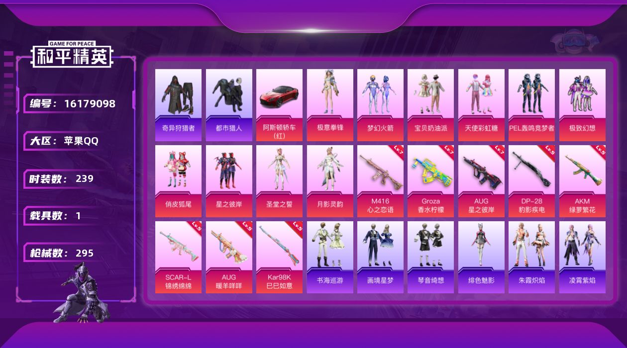 苹果 手Q-10粉装-8特效枪-1载具-6粉色飞行器-98295热力值-14王牌印记-239套装-295枪皮