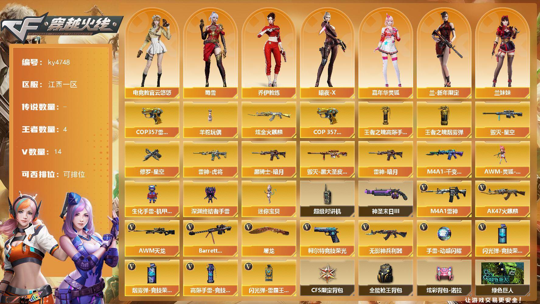 [16191352]江西一区-14V-4王者-1炫金 【热门武器】:羊驼玩偶,COP 357-雷霆王者 【王者炫金武器】:COP 357-雷霆王者,炫金火麒麟,王者之魄高爆手雷,王者之魄烟雾弹 【皮肤】:雷神-暗月,雷神-虎将,毁灭-星空,毁灭-黑大圣皮肤,M4A1-千变-孔明皮肤,黑骑士-暗月,修罗-星空 【角色】:电竞教官-云悠悠,乔伊教练,暗夜-X,嘉年华灵狐,兰-新年限定,兰妹妹,灵狐-花神,曼陀罗-X,蜀雪,维纳斯,雪莉杨-摸金校尉,夜玫瑰-宠粉 【人偶武器】:迷你宝贝,AWM-灵狐-15周年嘉年华,生化手雷-机甲核心*2,深渊终结者手雷 【暴走生化】:超级对讲机 【挑战大师】:神圣爆裂者-末日III 【英雄级武器】:AK47-火麒麟,M4A1-雷神,无影-神兵利器,AWM-天龙,Barrett-毁灭,柯尔特-竞技荣光,屠龙,高爆手雷-竞技荣光*2,手雷-动感闪耀,闪光弹-竞技荣光,闪光弹-雷霆王者-觉醒版,烟雾弹-竞技荣光 【道具】:CFS限定背包,全能枪王背包,炫彩背包-诺拉,绿色巨人,灵魂忍者,迷雾幽灵,夺命之镰,防化服*3,金色流光-枪王排位,星辰流光-枪王排位,枪王排位28赛季金色流光,枪王排位29赛季金色流光,EP战队名片,EP战队喷图,EP战队击杀图标,防弹头盔*3,防弹衣*3,C4工具钳*3,手雷包*3 【特殊枪械】: