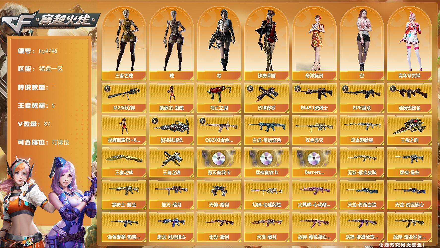 [16191462]福建一区-82V-5王者-2炫金 【热门武器】:QBZ03-金色蔷薇,M200-幻神,死亡之眼,白虎-电玩蓝兔,M4A1-黑骑士,汤姆逊-烈龙*6,RPK-盘龙*5,加特林-炼狱*3,斯泰尔-蝴蝶,沙鹰-修罗*5 【王者炫金武器】:王者之魂,王者之刺,王者之锋,炫金超新星,炫金毁灭 【音效卡】:M4A1-雷神音效卡,Barrett-毁灭音效卡,Barrett-碧霄极光音效卡*4 【皮肤】:幻神-动感闪耀 皮肤,金色蔷薇-热带奇洋 皮肤,雷神-星空,火麒麟-心动糖果,毁灭-暗月,黑龙-能量核心,黑骑士耀金皮肤,无影-暗月*2,无影耀金皮肤,天启-暗月,战神-粉色甜心皮肤,战神-紫绶金章皮肤*4,战神-流金岁月皮肤*3,AK47-B-常胜将军-曹操,天龙-能量核心,AWM-天龙-传奇白鲨,天神-暗月 【角色】:零,瞳,王者之瞳,奇洋探员,空,嘉年华灵狐,龙儿,麻雀,潘多拉-X,潘多拉-甜心教官,斯沃特-X,铁骑荣耀,樱-战斗天使,影武者-X 【人偶武器】:斯泰尔-蝴蝶,AWM-灵狐-15周年嘉年华,迷你生化手雷*3,闪光弹-小乔,迷你超能女侍 【暴走生化】:死亡之眼,超级对讲机 【挑战大师】:激光毁灭者III 【英雄级武器】:M4A1-千变,AK47-火麒麟,M4A1-黑龙,M4A1-雷神,M4A1-黑骑士,AK47-无影,M4A1-死神,AK47-黑武士,AK12-天启,AN94-超新星,AK47-机械迷城,AK47-黑鲨,黑武士-锦绣游龙,超新星-热带奇洋,M4A1-玫瑰精灵,QBZ03-金色蔷薇,M4A1-猎神,王者之武-觉醒版,AK-47-猩红传说*8,AK47-B-战神*2,AK47-B-常胜将军,白虎-电玩蓝兔,AWM-天龙,Barrett-毁灭,Barrett-极光,AWM-裁决,M200-幻神,Barrett-金色蔷薇,RPK-盘龙*5,加特林-炼狱*3,汤姆逊-烈龙*6,沙鹰-修罗*5,沙鹰-天神,屠龙*2,龙啸,麒麟刺-堕天神,擎天,麒麟刺,龙啸-热带奇洋,王者之刺-觉醒版,高爆手雷-雷霆*2,高爆手雷-堕天神,手雷-热带奇洋,闪光弹-雷霆*2,闪光弹-堕天神,烟雾弹-雷霆*2,烟雾弹-堕天神,M4A1-赤狱骑士,Barrett-碧霄极光*2 【道具】:CFS限定背包,奇洋探员-海龟背包,战舰背包,炫彩背包,热带奇洋炫彩背包,超级背包,圣拳猎手-炽
