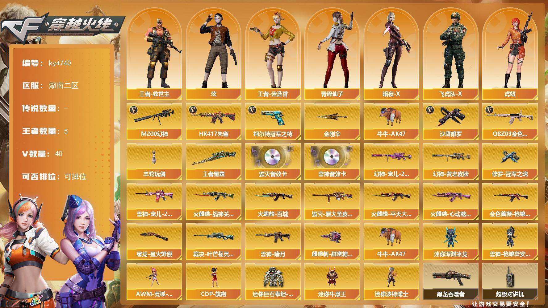 [16191830]湖南二区-40V-5王者-0炫金 【热门武器】:QBZ03-金色蔷薇,HK417-朱雀,M200-幻神,柯尔特-冠军之特,牛牛-AK47,羊驼玩偶,沙鹰-修罗*5,金刚伞 【王者炫金武器】:王者星霆 【音效卡】:M4A1-雷神音效卡,Barrett-毁灭音效卡 【皮肤】:M200-幻神-黄忠皮肤,幻神-宠儿-2021MVP,金色蔷薇-枪娘阿敏 皮肤,裁决-叶芒苍灵 皮肤,雷神-暗月,雷神-宠儿-2019MVP,火麒麟-战神关羽,火麒麟-平天大圣,火麒麟-百城,火麒麟-心动糖果,毁灭-黑大圣皮肤,修罗-冠军之魂,屠龙-星火燎原,麒麟刺-甜蜜糖果 皮肤 【角色】:炫,王者-救世主,王者-迷迭香,暗夜-X,飞虎队-X,虎妞,嘉年华灵狐,娟娟,灵狐-花神,灵狐者-X,青霞仙子,斯沃特-X 【人偶武器】:雷神-枪娘蕾安娜,AWM-灵狐-15周年嘉年华,COP-旗袍,牛牛-AK47,迷你深渊冰龙,迷你牛魔王,迷你波特博士,迷你巨石泰坦-魔花研究所 【暴走生化】:黑龙吞噬者,超级对讲机 【挑战大师】:神圣爆裂者-末日III 【英雄级武器】:AK47-火麒麟*2,M4A1-雷神,HK417-朱雀,无影-神兵利器,黑武士-锦绣游龙,QBZ03-金色蔷薇,王者火魄-觉醒版,白虎之魄-觉醒版,Barrett-毁灭,AWM-裁决,M200-幻神,沙鹰-修罗*5,柯尔特-冠军之特,USP-神工天巧,屠龙*2,麒麟刺,唐刀-神工天巧,高爆手雷-神工天巧*4,闪光弹-神工天巧*6,闪光弹-雷霆王者-觉醒版,烟雾弹-神工天巧*5 【道具】:BS战队炫彩背包,全能枪王背包,炫彩背包,背包-洛丽塔,超级背包,女皇终结者-魔龙之吻,绿色巨人,灵魂忍者*3,变异宝贝,迷雾幽灵*3,生化弹匣,夺命之镰,防化服*3,金色流光-枪王排位*2,星辰流光-枪王排位,巅峰赛先锋-金色流光,枪王排位28赛季金色流光,枪王排位29赛季金色流光,C4-黑曜,防弹头盔*3,防弹衣*3,C4工具钳*3,手雷包*3 【特殊枪械】:
