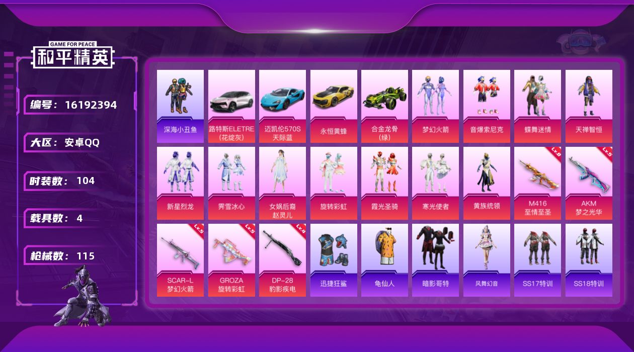 [16192394]【特价出售/店主推荐】安卓 手Q-11粉装-5特效枪-4载具-3粉色飞行器-4.8w热力值-9王牌印记-104套装-115枪皮