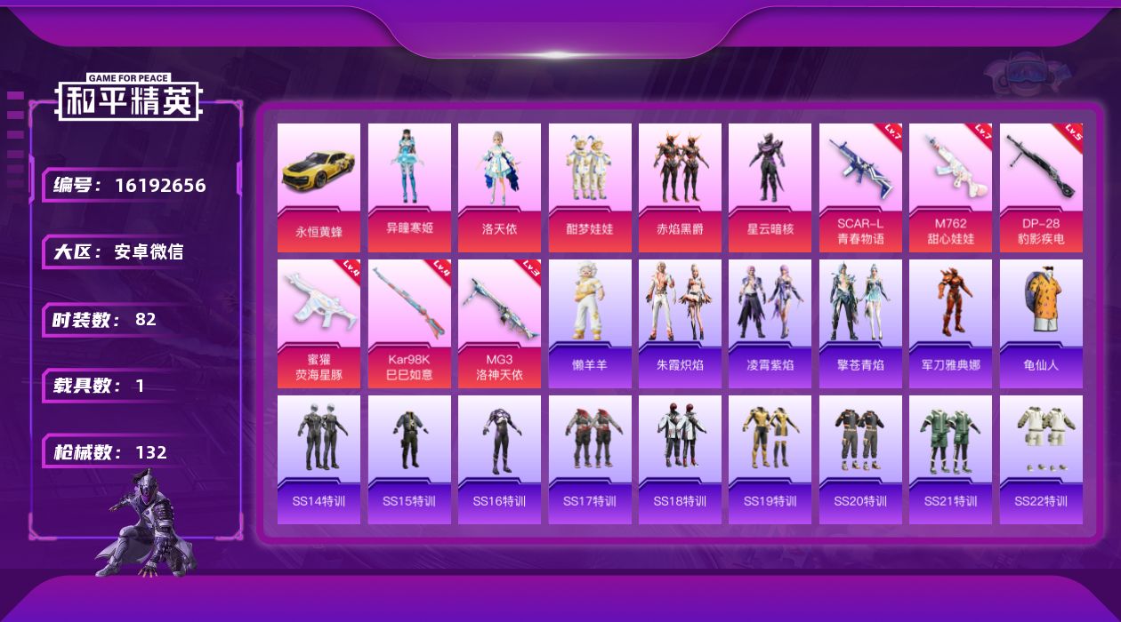 [16192656]【店主推荐捡漏号!可直接换绑】安卓 微信-5粉装-6特效枪-1载具-0粉色飞行器-44983热力值-3王牌印记-82套装-132枪皮【热门品类】:角色-军刀雅典娜,套装-龟仙人【粉色载具】:永恒黄蜂【粉色套装】:角色-洛天依,粉装-酣梦娃娃,粉装-赤焰黑爵,角色-星云暗核,角色-异瞳寒姬【粉色枪皮等级】:SCAR-L-青春物语(七级),M762-甜心娃娃(七级),蜜獾-荧海星豚(四级),Kar98K-巳巳如意(四级),DP-28-豹影疾电(五级),MG3-洛神天依(三级)【粉色枪皮】:SCAR-L-青春物语,M762-甜心娃娃,蜜獾-荧海星豚,Kar98K-巳巳如意,DP-28-豹影疾电,MG3-洛神天依
