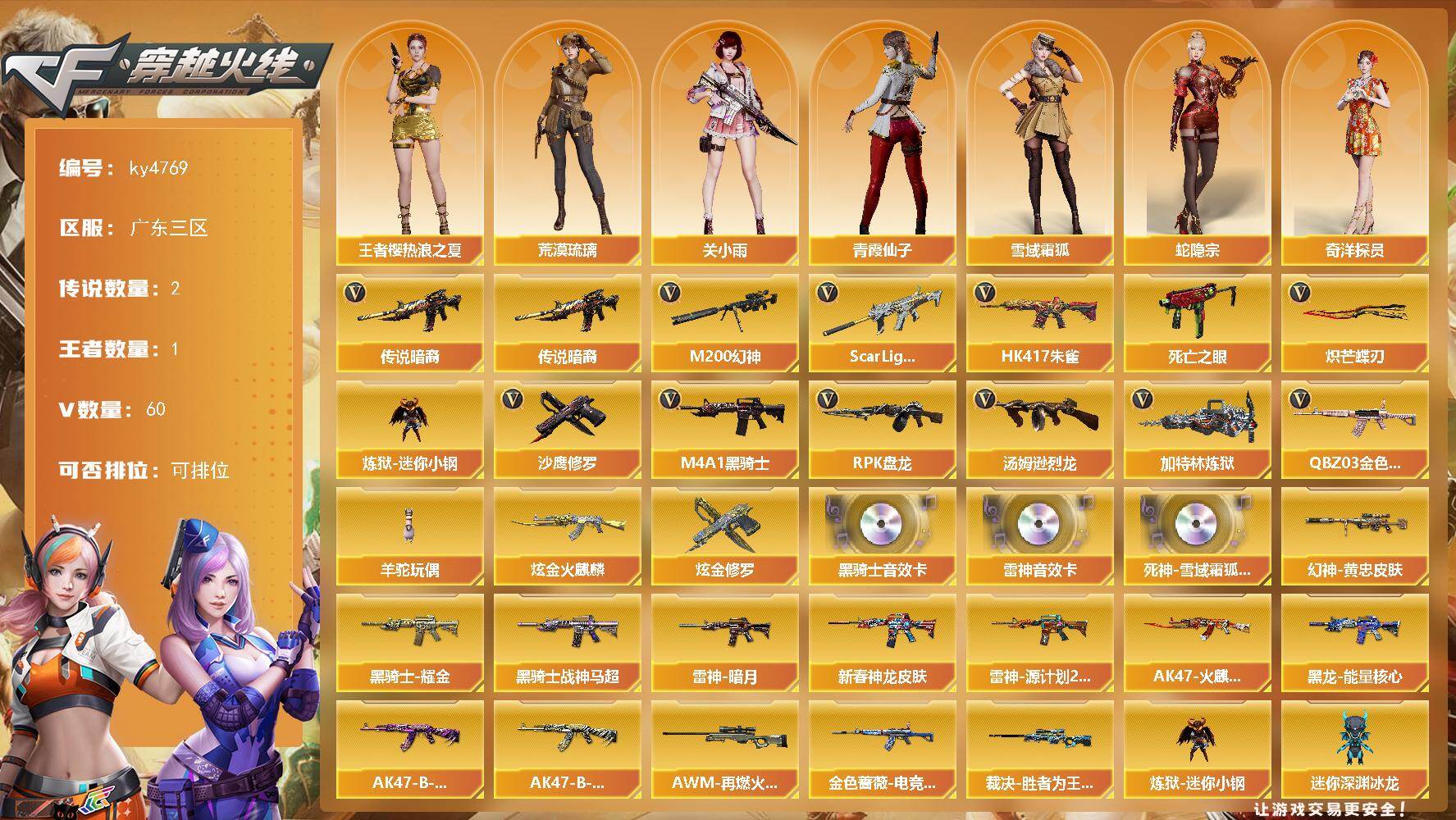 [16193442]广东三区-60V-1王者-2炫金 【传说武器】:传说暗裔*2 【热门武器】:传说暗裔*2,QBZ03-金色蔷薇,Scar Light-白虎,HK417-朱雀,M200-幻神*2,死亡之眼,炼狱-迷你小钢,M4A1-黑骑士*4,汤姆逊-烈龙*2,RPK-盘龙*3,加特林-炼狱*2,羊驼玩偶,沙鹰-修罗,炽芒蝶刃 【王者炫金武器】:炫金火麒麟,炫金修罗 【音效卡】:M4A1-雷神音效卡,M4A1-黑骑士音效卡,死神-雪域霜狐-怀旧音效卡 【皮肤】:M200-幻神-黄忠皮肤*2,金色蔷薇-电竞之星 皮肤,裁决-胜者为王 皮肤,雷神-暗月,M4A1-雷神-新春神龙皮肤,雷神-源计划2.0专属 皮肤,AK47-火麒麟-百城23冠军皮肤,黑龙-能量核心,黑骑士耀金皮肤,黑骑士-战神马超,AK47-B-常胜将军-曹操,AK47-B-常胜将军-刘备,AWM-再燃火线 【角色】:荒漠琉璃,关小雨,王者樱-热浪之夏,雪域霜狐,蛇隐宗,奇洋探员,暗夜-X,芳心审判者,飞虎队-X,嘉年华灵狐,娟娟,灵狐者-X,麻雀,潘多拉-X,潘多拉-甜心教官,青霞仙子,蛇姬,斯沃特-X,兔囡囡,影武者-X,游珑儿 【人偶武器】:炼狱-迷你小钢,迷你钢铁终结者,迷你救赎猎手,斯泰尔-枪娘暗刃,AWM-灵狐-15周年嘉年华,迷你深渊冰龙*2,迷你裂空之翼*8,迷你波特博士*2,夺魂*2,迷你火种*2,迷你生化手雷*2,生化手雷-机甲核心*3,深渊终结者手雷*2,闪光弹-貂蝉,高爆手雷-大乔,迷你艾比,迷你巨石泰坦-魔花研究所,灵狐娃娃手雷*3 【暴走生化】:异变清道夫,死亡之眼,超级对讲机 【挑战大师】:冰龙粉碎者-白马银枪,机甲撕裂者III,试炼破坏者III,KAC-圣炎切割者III,神圣爆裂者-末日III 【英雄级武器】:AK47-火麒麟,M4A1-黑龙,M4A1-雷神,M4A1-黑骑士*4,M4A1-死神*2,AK12-天启,AK47-黑鲨,M4A1-龙血,HK417-朱雀,Scar Light-白虎,QBZ03-天罚,无影-神兵利器,黑武士-锦绣游龙,超新星-热带奇洋,FAMAS G2-天戎,死神-雪域霜狐,SCAR Light-玄豹,M4A1-玫瑰精灵,QBZ03-金色蔷薇,AK47-B-常胜将军,Barrett-毁灭,AWM-裁决,M200-幻神*2,王者星神-觉醒版,RPK-盘龙*3,加特林