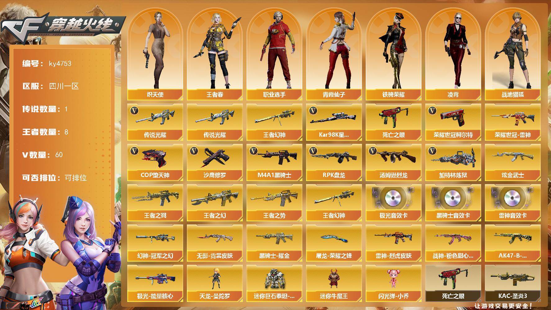 [16196447]四川一区-60V-8王者-1炫金 【传说武器】:传说光耀 【热门武器】:传说光耀,王者幻神,死亡之眼,荣耀世冠-雷神,荣耀世冠-柯尔特,Kar98K-星神,M4A1-黑骑士,汤姆逊-烈龙*2,RPK-盘龙,加特林-炼狱,COP-堕天神*2,沙鹰-修罗*2 【王者炫金武器】:王者之戮,王者之幻,王者之势,王者幻神,炫金武士 【音效卡】:M4A1-雷神音效卡,M4A1-黑骑士音效卡,Barrett-极光音效卡 【皮肤】:幻神-冠军之幻,雷神-烈虎皮肤,黑骑士耀金皮肤,无影-霓裳皮肤,战神-粉色甜心皮肤,AK47-B-常胜将军-孙权,极光-能量核心,屠龙-荣耀之锋 【角色】:凌霄,战地猎狐,王者春,炽天使,暗夜-X,风暴女,虎妞,邱刚敖,青霞仙子,铁骑荣耀,影武者-X,职业选手 【人偶武器】:天龙-曼陀罗,迷你牛魔王,闪光弹-小乔,迷你巨石泰坦-魔花研究所 【暴走生化】:死亡之眼 【挑战大师】:KAC-圣炎切割者III 【英雄级武器】:M4A1-千变*2,M4A1-雷神,M4A1-黑骑士,AK47-无影,AK12-天启*3,M4A1-夜魔,M4A1-玫瑰精灵,王者之魄-觉醒版,荣耀世冠-雷神,黑武士-CF网剧冠军,AWM-天龙,Barrett-极光,Kar98K-星神,王者之光-觉醒版,RPK-盘龙,加特林-炼狱,汤姆逊-烈龙*2,AA-12-雷霆,沙鹰-修罗*2,COP-堕天神*2,荣耀世冠-柯尔特,破空枪刃-夜魔*2,天神-CF网剧冠军,屠龙*2,龙啸,马来剑-夜魔,擎天-CF网剧冠军,王者之锋-觉醒版,王者之啸-觉醒版,高爆手雷-夜魔*7,高爆手雷-幻灵,闪光弹-夜魔*7,烟雾弹-夜魔*7,M4A1-赤狱骑士 【道具】:BS战队炫彩背包,冰冰企鹅背包-猛男专用,炫彩背包,牛魔王背包-至尊黄金,超级背包,绿色巨人,灵魂忍者,迷雾幽灵,夺命之镰,防化服*2,枪王排位29赛季金色流光,防弹头盔*2,防弹衣*2,C4工具钳*2,手雷包*2 【特殊枪械】:1黑骑士,2烈龙,1盘龙,1炼狱