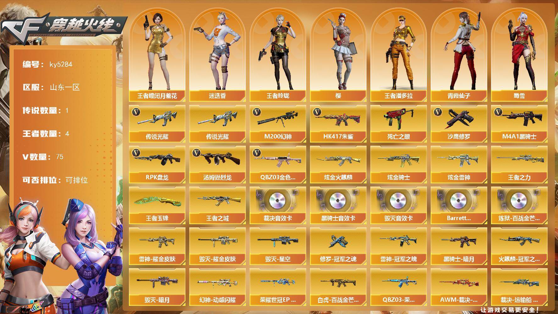 [16197582]山东一区-75V-4王者-3炫金 【传说武器】:传说光耀 【热门武器】:传说光耀,QBZ03-金色蔷薇,HK417-朱雀,M200-幻神,死亡之眼,M4A1-黑骑士,汤姆逊-烈龙*2,RPK-盘龙,沙鹰-修罗*2 【王者炫金武器】:王者之城,王者之力,王者玉锋,炫金火麒麟,炫金骑士,炫金雷神 【音效卡】:M4A1-黑骑士音效卡,Barrett-毁灭音效卡,AWM-裁决音效卡,Barrett-碧霄极光音效卡*3,炼狱-百战金芒-庆典舞曲音效卡 【皮肤】:幻神-动感闪耀 皮肤,幻神-荣耀世冠EP 皮肤,幻神-电竞之星 皮肤,白虎-百战金芒 皮肤,QBZ03-荣耀世冠EP 皮肤,AWM-裁决-凤灵皮肤,裁决-运输船 皮肤,雷神-耀金皮肤,雷神-冠军之魄,M4A1-再燃火线,雷神-神秘按键 皮肤,火麒麟-雷神,火麒麟-冠军之心,毁灭-暗月,毁灭耀金皮肤,毁灭-星空,毁灭-航天科技皮肤,毁灭-英雄计划 皮肤,黑骑士-暗月,无影-能量核心,战神-紫绶金章皮肤*2,战神-流金岁月皮肤*5,极光-能量核心,修罗-能量核心,修罗-冠军之魂,屠龙-惊鸿 皮肤,轻型军用手斧-再燃火线 【角色】:樱,迷迭香,玄豹,战地猎狐,王者-瞳-闭月羞花,王者玲珑,王者潘多拉,奇洋探员,乔伊教练,修道士,云海玲珑,初恋灵狐,芳心审判者,兰妹妹,龙儿,龙儿-小淘气,潘多拉-甜心教官,青霞仙子,蜀雪,铁骑荣耀,兔囡囡,维纳斯,新娜塔莎,雪莉杨,影武者-X,智影 【人偶武器】:异变清道夫-蛇影双骄,AWM-灵狐-15周年嘉年华*2,迷你深渊冰龙,生化手雷-机甲核心,闪光弹-小乔 【暴走生化】:死亡之眼 【挑战大师】:激光毁灭者III-白马银枪 【英雄级武器】:AK47-火麒麟,M4A1-雷神*2,M4A1-黑骑士,AK47-无影,HK417-朱雀,SCAR Light-玄豹,QBZ03-金色蔷薇,AK-47-猩红传说*5,AK47-B-战神,黑武士-CF网剧冠军,AWM-天龙*2,Barrett-毁灭*2,Barrett-极光,AWM-裁决,M200-幻神,Barrett-金色蔷薇,王者幻神-觉醒版,RPK-盘龙,炼狱-百战金芒,汤姆逊-烈龙*2,沙鹰-修罗*2,柯尔特-荣耀世冠EP,Anaconda-玄豹,天神-CF网剧冠军,屠龙*3,龙啸,擎天*2,擎天-CF网剧冠军,麒麟刺-百战金芒,丛林匕首-玄豹