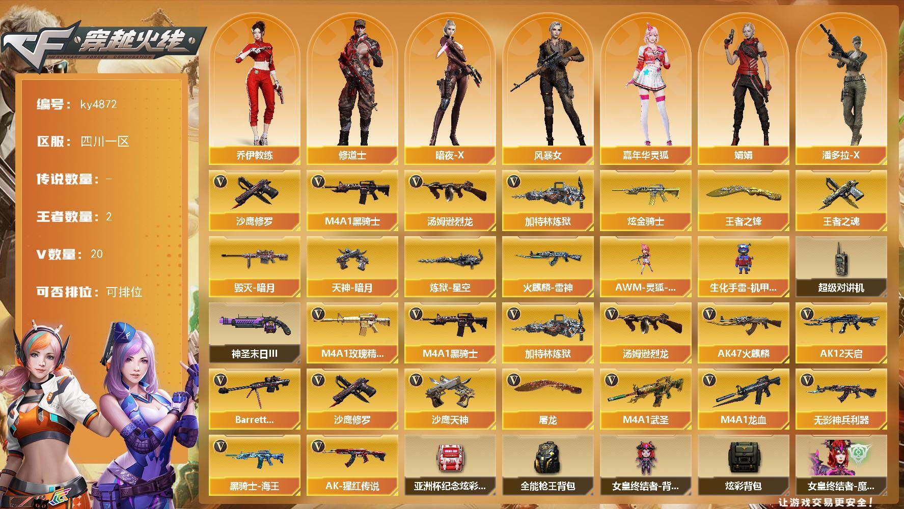 [16198009]四川一区-20V-2王者-1炫金 【热门武器】:M4A1-黑骑士,汤姆逊-烈龙*2,加特林-炼狱,沙鹰-修罗 【王者炫金武器】:王者之魂,王者之锋,炫金骑士 【皮肤】:火麒麟-雷神,毁灭-暗月,炼狱-星空,天神-暗月 【角色】:乔伊教练,修道士,暗夜-X,风暴女,嘉年华灵狐,娟娟,潘多拉-X,斯沃特-X,新娜塔莎 【人偶武器】:AWM-灵狐-15周年嘉年华,生化手雷-机甲核心 【暴走生化】:超级对讲机 【挑战大师】:神圣爆裂者-末日III 【英雄级武器】:AK47-火麒麟*2,M4A1-黑骑士,AK12-天启,M4A1-武圣,M4A1-龙血*2,无影-神兵利器,M4A1-玫瑰精灵,AK-47-猩红传说*2,黑骑士-海王,Barrett-毁灭,加特林-炼狱,汤姆逊-烈龙*2,沙鹰-修罗,沙鹰-天神,屠龙 【道具】:亚洲杯纪念炫彩背包,全能枪王背包,女皇终结者-背包,炫彩背包,女皇终结者-魔龙之吻,绿色巨人,灵魂忍者,迷雾幽灵,夺命之镰,防化服*3,金色流光-枪王排位*2,流光-鎏金之域,枪王排位29赛季金色流光,防弹头盔*7,防弹衣*7,C4工具钳*7,手雷包*7 【特殊枪械】:1黑骑士,2烈龙,1炼狱