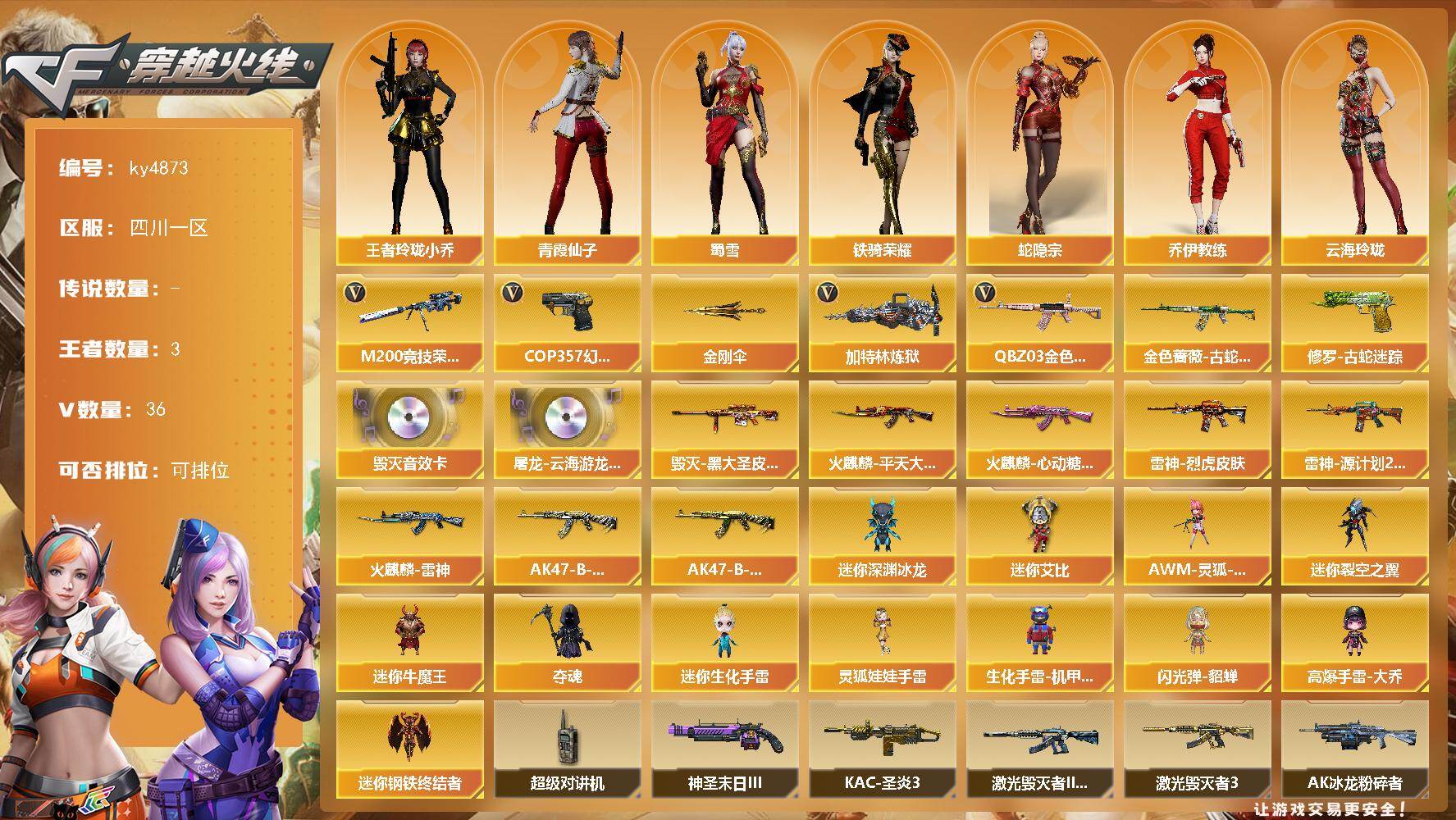[16198298]四川一区-36V-3王者-0炫金 【热门武器】:QBZ03-金色蔷薇,金色蔷薇-古蛇迷踪,修罗-古蛇迷踪,M200-竞技荣光,加特林-炼狱,COP 357-幻灵,金刚伞 【音效卡】:屠龙-云海游龙音效卡,Barrett-毁灭音效卡 【皮肤】:雷神-烈虎皮肤,雷神-源计划2.0专属 皮肤,火麒麟-雷神,火麒麟-平天大圣,火麒麟-心动糖果,毁灭-黑大圣皮肤,AK47-B-常胜将军-刘备,AK47-B-常胜将军-孙权*2 【角色】:王者玲珑-小乔,蛇隐宗,乔伊教练,云海玲珑,暗夜-X,初恋灵狐,芳心审判者,风暴女*2,虎妞,嘉年华灵狐,娟娟,灵狐者-黄金海岸,灵狐者-七夕宝贝,龙儿-小淘气,麻雀,潘多拉-X,青霞仙子,蛇姬,斯沃特-X,蜀雪,铁骑荣耀,兔囡囡,新娜塔莎,影武者-X 【人偶武器】:迷你钢铁终结者,AWM-灵狐-15周年嘉年华,迷你深渊冰龙,迷你裂空之翼,迷你牛魔王,夺魂*3,迷你生化手雷,生化手雷-机甲核心,闪光弹-貂蝉,高爆手雷-大乔,迷你艾比,灵狐娃娃手雷 【暴走生化】:超级对讲机 【挑战大师】:AK47-冰龙粉碎者,冰龙粉碎者-白马银枪,激光毁灭者III-白马银枪,激光毁灭者III,KAC-圣炎切割者III,神圣爆裂者-末日III 【英雄级武器】:AK47-火麒麟,M4A1-雷神,AK47-黑鲨,无影-神兵利器,金色蔷薇-古蛇迷踪,QBZ03-金色蔷薇,烈火-动感闪耀,AK-47-猩红传说,AK47-B-战神,黑骑士-海王*3,AK47-B-常胜将军,Barrett-毁灭,Barrett-朱雀,M200-竞技荣光,王者之怒-觉醒版,加特林-炼狱,COP 357-幻灵,天神-动感闪耀,修罗-古蛇迷踪,屠龙,幻灵之锋*2,擎天-竞技荣光,屠龙-动感闪耀,王者之啸-觉醒版*2,高爆手雷-幻灵,高爆手雷-竞技荣光,手雷-动感闪耀,高爆手雷-古蛇迷踪,闪光弹-幻灵,闪光弹-竞技荣光,烟雾弹-幻灵,烟雾弹-竞技荣光,烟雾弹-古蛇迷踪 【道具】:AG战队炫彩背包,XROCK炫彩背包,古蛇迷踪炫彩背包,老虎背包,超级背包,女皇终结者-魔龙之吻,救世主-黑桃战神,黄金生化钩,绿色巨人,灵魂忍者,变异宝贝,迷雾幽灵,生化弹匣,夺命之镰,防化服*3,金色流光-枪王排位*2,星辰流光-枪王排位,枪王排位29赛季金色流光,古蛇迷踪打击特效,蛇隐宗表情,动感闪耀表情,防弹头盔*