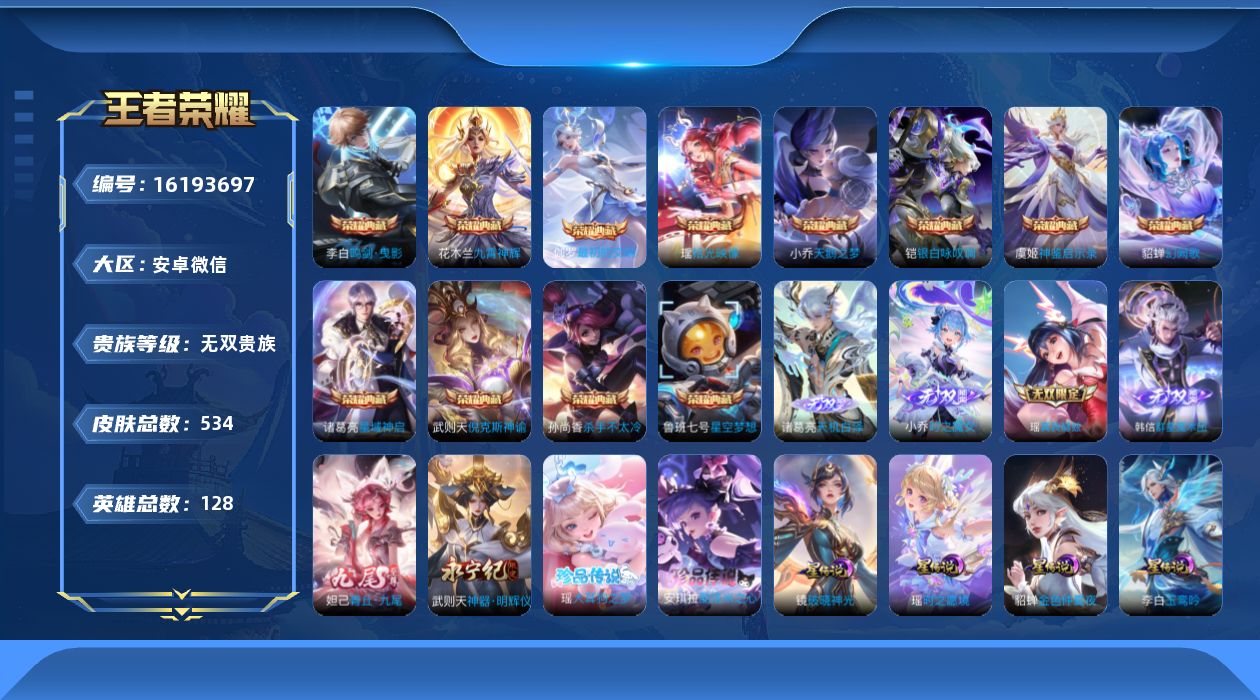 [16193697]安卓WX-V11-最强王者段位-128英雄-534皮肤-12典藏皮肤-1典藏英雄-6星元-6无双-2珍品传说-67传说-184史诗