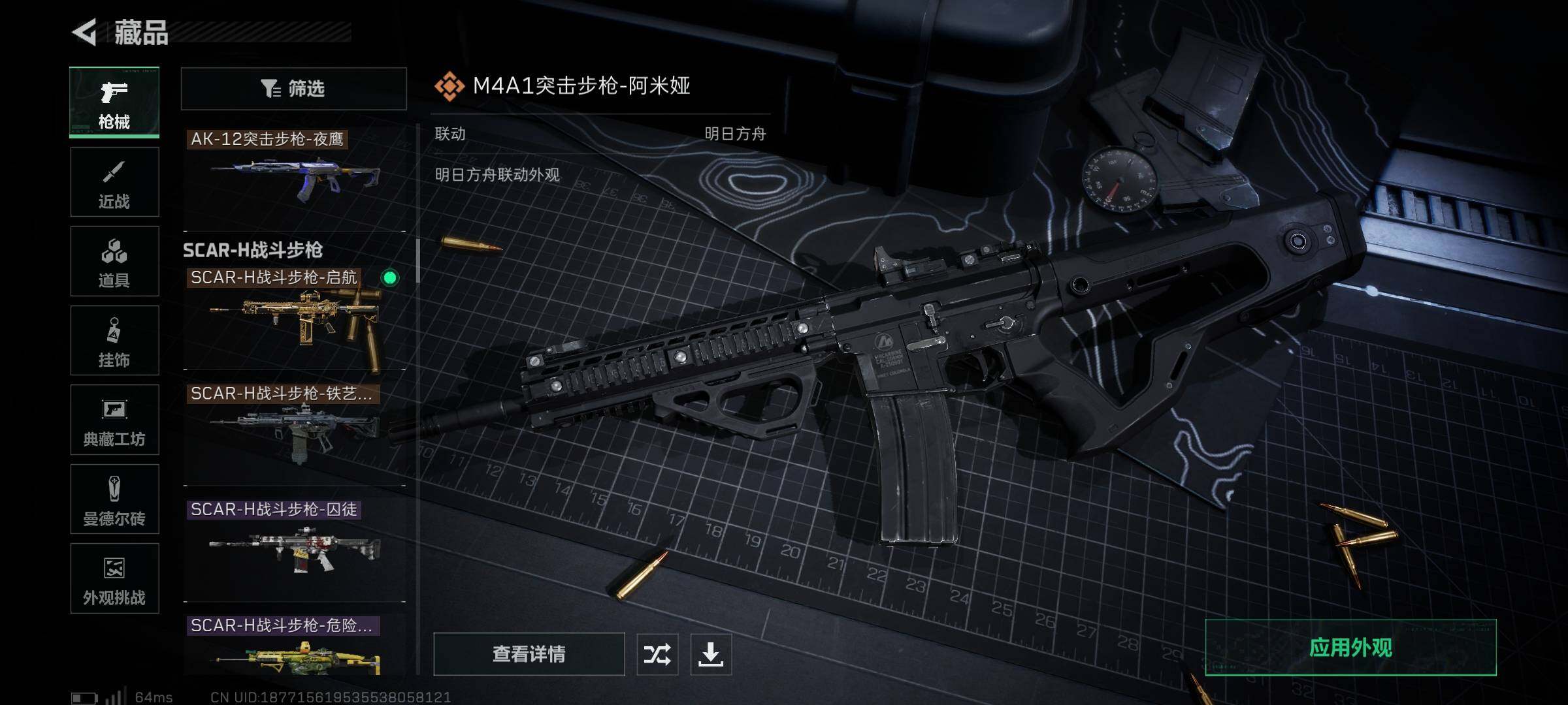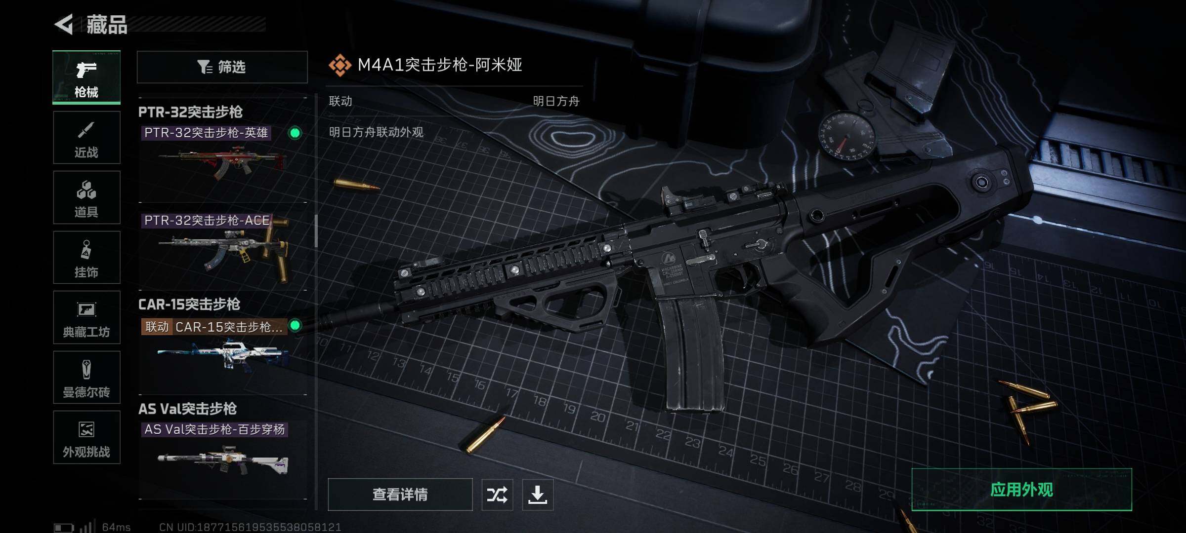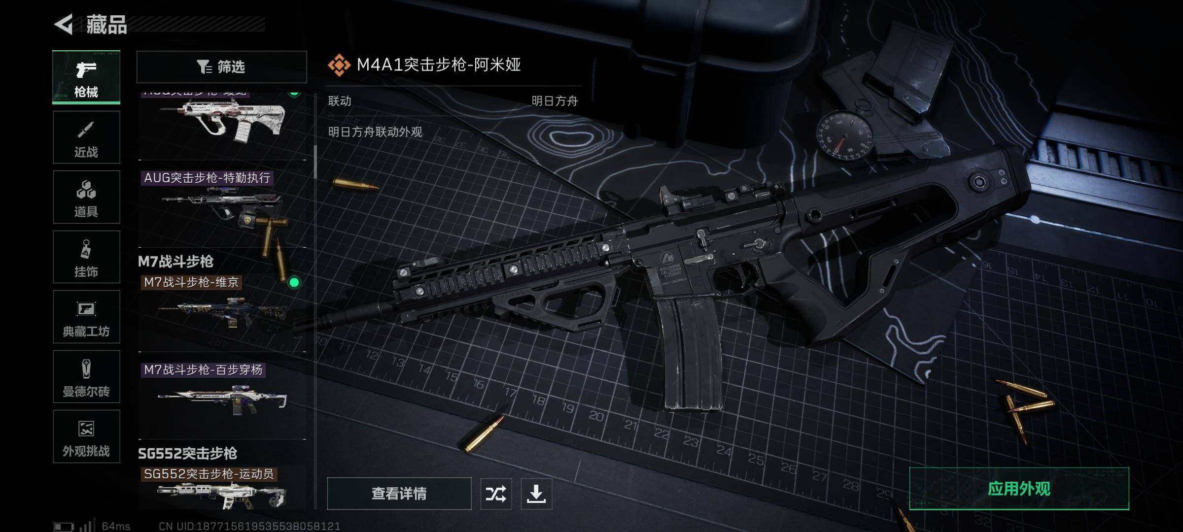 【史诗外观】:M4A1突击步枪-特勤执行,AKM突击步枪-林中猎手,QBZ95-1突击步枪-曙光,QBZ95-1突击步枪-ACE,ASh-12战斗步枪-守夜人,ASh-12战斗步枪-无极限,AUG突击步枪-蝮蛇,AUG突击步枪-特勤执行,M7战斗步枪-百步穿杨,SG552突击步枪-尖端治疗,SG552突击步枪-深海恐惧,SCAR-H战斗步枪-危险实验,SCAR-H战斗步枪-囚徒,G3战斗步枪-流沙送葬,PTR-32突击步枪-ACE,AS Val突击步枪-尖端治疗,AS Val突击步枪-百步穿杨,腾龙突击步枪-无垢,腾龙突击步枪-猎鳄行动,K437突击步枪-守护者,MP5冲锋枪-深海恐惧,MP5冲锋枪-战术竞备,MP5冲锋枪-竞技风,Vector冲锋枪-阿萨拉文明,Vector冲锋枪-红色彗星,Vector冲锋枪-猎鳄行动,Vector冲锋枪-百步穿杨,UZI冲锋枪-危险实验,SR-3M紧凑突击步枪-英雄,SR-3M紧凑突击步枪-荒野求生,SR-3M紧凑突击步枪-战术竞备,勇士冲锋枪-深海恐惧,勇士冲锋枪-工业狂潮,MP7冲锋枪-无垢,
