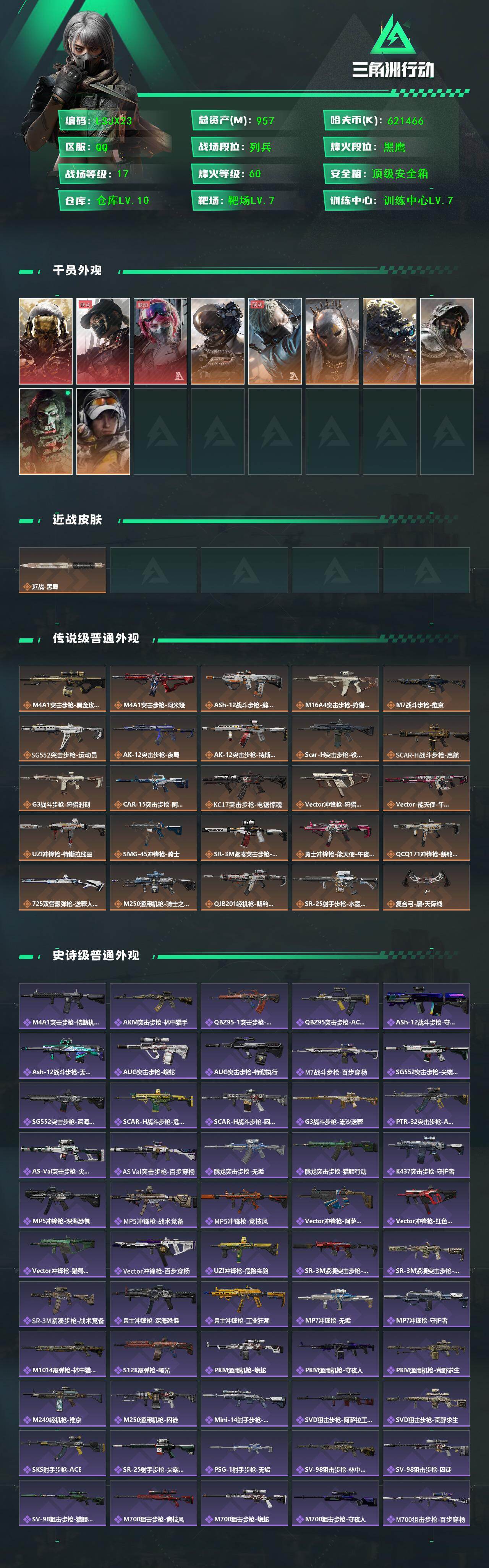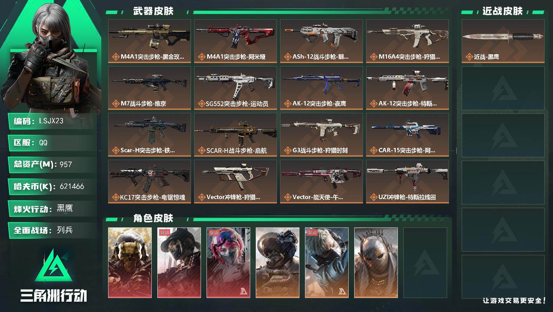 [16198550]可二次【特价出售/店主推荐】957m总资产-621466k哈伏币-60烽火等级-黑鹰-17战场等级-列兵 【干员外观】:红狼-蚀金玫瑰,露娜-黑·天际线,蛊-能天使午夜邮差,威龙-壮志凌云,蜂医-送葬人·无题密令,牧羊人-街头之王,无名-夜鹰,深蓝-不破誓约,红狼-电锯惊魂,露娜-金牌射手 【近战皮肤】:近战-黑鹰 【传说外观】:M4A1突击步枪-蚀金玫瑰,M4A1突击步枪-阿米娅,ASh-12战斗步枪-鹅鸭杀,M16A4突击步枪-狩猎时刻,M7战斗步枪-维京,SG552突击步枪-运动员,AK-12突击步枪-夜鹰,AK-12突击步枪-特斯拉线圈,SCAR-H战斗步枪-铁艺苍穹,SCAR-H战斗步枪-启航,G3战斗步枪-狩猎时刻,CAR-15突击步枪-阿米娅,KC17突击步枪-电锯惊魂,Vector冲锋枪-狩猎时刻,Vector冲锋枪-能天使-午夜邮差,UZI冲锋枪-特斯拉线圈,SMG-45冲锋枪-骑士,SR-3M紧凑突击步枪-特斯拉线圈,勇士冲锋枪-能天使-午夜邮差,QCQ171冲锋枪-鹅鸭杀,725双管霰弹枪-送葬人-无题密令,M250通用机枪-骑士之心,QJB201轻机枪-鹅鸭杀,SR-25射手步枪-水墨云图,复合弓-黑·天际线 【史诗外观】:M4A1突击步枪-特勤执行,AKM突击步枪-林中猎手,QBZ95-1突击步枪-曙光,QBZ95-1突击步枪-ACE,ASh-12战斗步枪-守夜人,ASh-12战斗步枪-无极限,AUG突击步枪-蝮蛇,AUG突击步枪-特勤执行,M7战斗步枪-百步穿杨,SG552突击步枪-尖端治疗,SG552突击步枪-深海恐惧,SCAR-H战斗步枪-危险实验,SCAR-H战斗步枪-囚徒,G3战斗步枪-流沙送葬,PTR-32突击步枪-ACE,AS Val突击步枪-尖端治疗,AS Val突击步枪-百步穿杨,腾龙突击步枪-无垢,腾龙突击步枪-猎鳄行动,K437突击步枪-守护者,MP5冲锋枪-深海恐惧,MP5冲锋枪-战术竞备,MP5冲锋枪-竞技风,Vector冲锋枪-阿萨拉文明,Vector冲锋枪-红色彗星,Vector冲锋枪-猎鳄行动,Vector冲锋枪-百步穿杨,UZI冲锋枪-危险实验,SR-3M紧凑突击步枪-英雄,SR-3M紧凑突击步枪-荒野求生,SR-3M紧凑突击步枪-战术竞备,勇士冲锋枪-深海恐惧,勇士冲锋枪-工业狂潮,MP7冲锋枪-无垢,