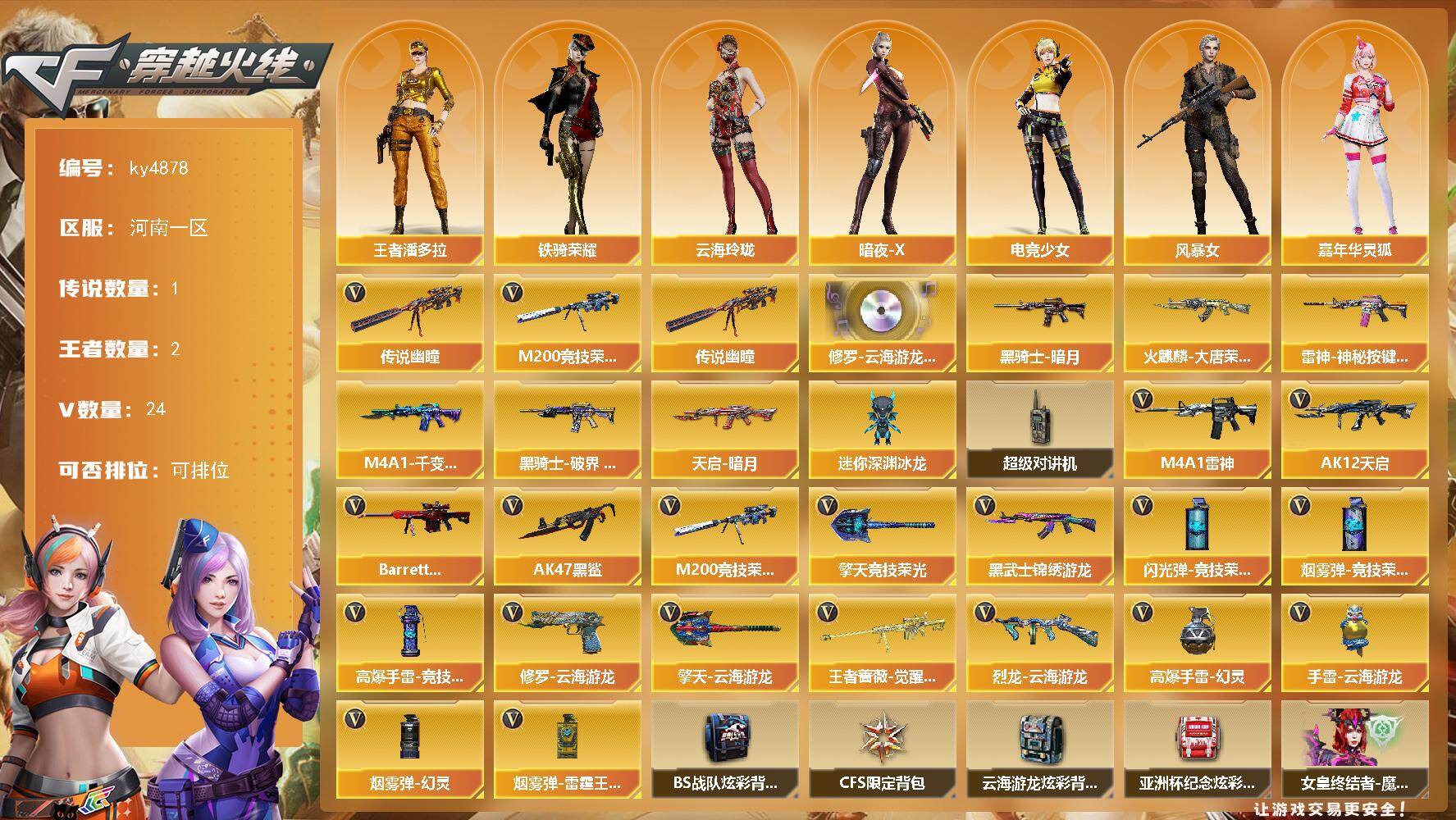 [16198674]河南一区-24V-2王者-0炫金 【传说武器】:传说幽瞳 【热门武器】:传说幽瞳,M200-竞技荣光 【音效卡】:修罗-云海游龙音效卡 【皮肤】:雷神-神秘按键 皮肤,火麒麟-大唐荣光,M4A1-千变-孔明皮肤,黑骑士-暗月,黑骑士-破界 皮肤,天启-暗月 【角色】:王者潘多拉,云海玲珑,暗夜-X,电竞少女,风暴女,嘉年华灵狐,娟娟,灵狐者-X,麻雀,曼陀罗-X,曼陀罗-礼服,潘多拉-甜心教官,铁骑荣耀,兔囡囡,雪莉杨,游珑儿 【人偶武器】:迷你深渊冰龙 【暴走生化】:超级对讲机 【英雄级武器】:M4A1-雷神*3,AK12-天启,AK47-黑鲨,黑武士-锦绣游龙,Barrett-极光,M200-竞技荣光,王者蔷薇-觉醒版,烈龙-云海游龙,修罗-云海游龙,擎天-竞技荣光,擎天-云海游龙,高爆手雷-幻灵*2,高爆手雷-竞技荣光,手雷-云海游龙,闪光弹-竞技荣光,烟雾弹-幻灵,烟雾弹-竞技荣光,烟雾弹-雷霆王者-觉醒版 【道具】:BS战队炫彩背包,CFS限定背包,云海游龙炫彩背包,亚洲杯纪念炫彩背包,女皇终结者-魔龙之吻,绿色巨人,灵魂忍者,迷雾幽灵,夺命之镰*2,防化服*3,金色流光-枪王排位*2,星辰流光-枪王排位,枪王排位28赛季金色流光,枪王排位29赛季金色流光,云海游龙表情,EP战队名片,EP战队喷图,防弹头盔*6,防弹衣*6,C4工具钳*6,手雷包*6 【特殊枪械】: