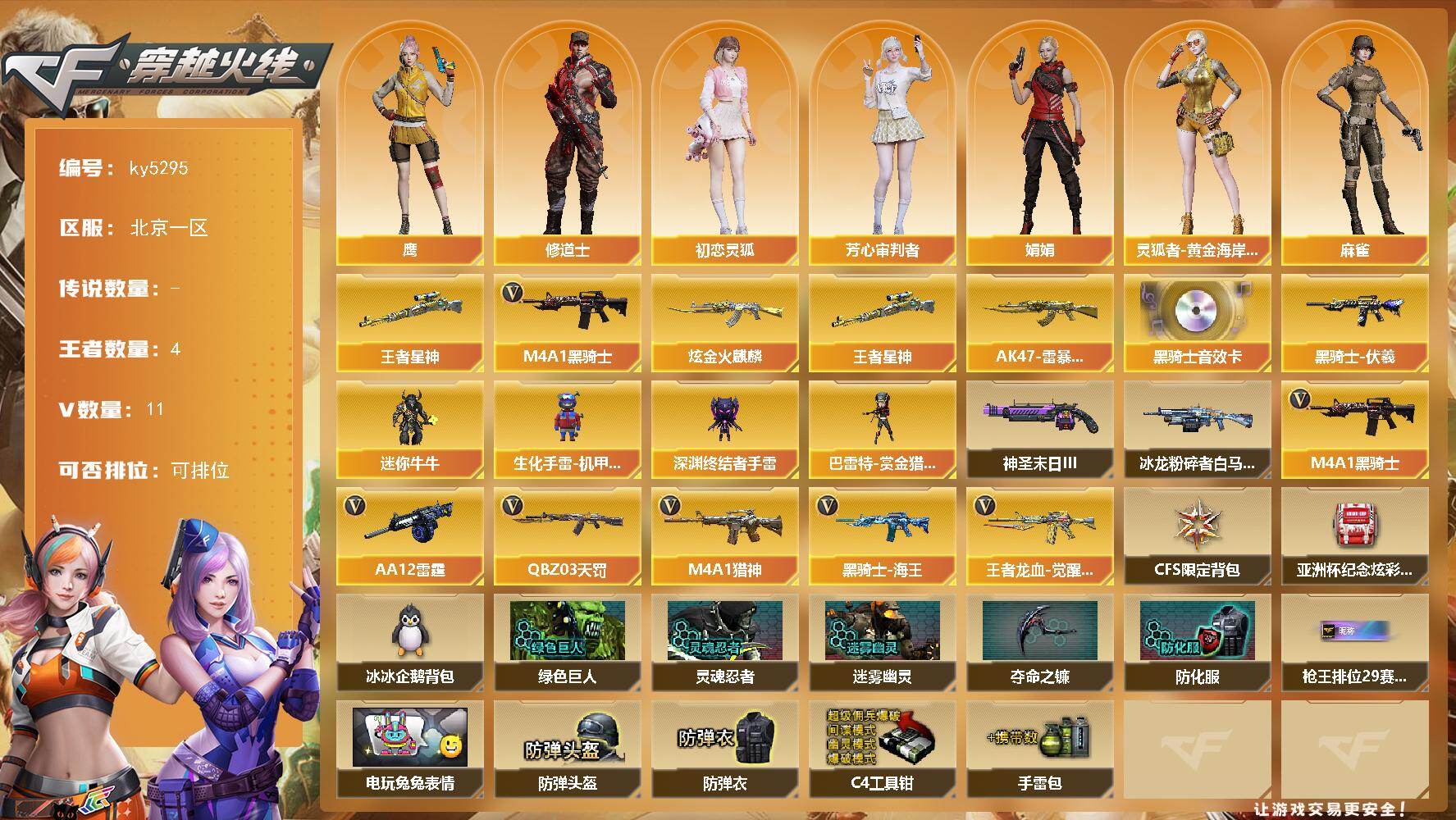 [16200217]北京一区-11V-4王者-1炫金 【热门武器】:王者星神,M4A1-黑骑士 【王者炫金武器】:AK47-雷暴王者,王者星神,炫金火麒麟 【音效卡】:M4A1-黑骑士音效卡 【皮肤】:黑骑士-伏羲 【角色】:鹰,修道士,初恋灵狐,芳心审判者,娟娟,灵狐者-黄金海岸,麻雀,潘多拉-X,潘多拉-甜心教官,兔囡囡 【人偶武器】:迷你牛牛,生化手雷-机甲核心,深渊终结者手雷,巴雷特-赏金猎人 【挑战大师】:冰龙粉碎者-白马银枪,神圣爆裂者-末日III 【英雄级武器】:M4A1-黑骑士,QBZ03-天罚,M4A1-猎神,黑骑士-海王,王者龙血-觉醒版,AA-12-雷霆 【道具】:CFS限定背包,亚洲杯纪念炫彩背包,冰冰企鹅背包,绿色巨人,灵魂忍者,迷雾幽灵*2,夺命之镰*2,防化服*2,枪王排位29赛季金色流光,电玩兔兔表情,防弹头盔*3,防弹衣*3,C4工具钳*3,手雷包*3 【特殊枪械】:1黑骑士