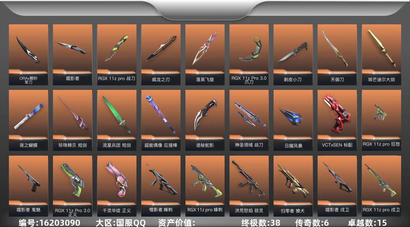 [16203090]【套装】:ORA x 颗秒套装,RGX 11z Pro套装,噬影者套装,RGX 11z Pro//3.0套装 【英雄】:幻棱,炼狱,维斯,暮蝶,钛狐,壹决,铁臂,捷风,雷兹,幽影,不死鸟,贤者,猎枭,蝰蛇,零,芮娜,奇乐,尚勃勒,霓虹,斯凯,夜露,星礈,K/O,海神,盖可,黑梦,钢锁 【近战武器】:近战武器-ORA x 颗秒 军刀,近战武器-RGX 11z Pro 战刀,近战武器-剥皮小刀,近战武器-RGX 11z Pro//3.0 爪刀,近战武器-落英飞旋,近战武器-噬影者 簇刃,近战武器-威龙之刃,近战武器-夜之蝴蝶,近战武器-埃芒迪尔大剑,近战武器-珍珠棘贝 短剑,近战武器-流星兵团 短剑,近战武器-超能偶像 应援棒,近战武器-天御刀,近战武器-诡秘蛇影 军刀,近战武器-神圣领域 战刀,近战武器-日耀风暴 遗器 【狂徒】:狂徒-艾沃莉的梦之翼,狂徒-洪荒怒焰,狂徒-机动狂飙,狂徒-全息波普//2.0,狂徒-虚空遗器,狂徒-噬影者,狂徒-RGX 11z Pro,狂徒-光荣异象,狂徒-ORA x 颗秒,狂徒-堕天遗武,狂徒-盖世英雄,狂徒-盖亚的复仇,狂徒-海洋之星,狂徒-日冕雄师,狂徒-离子武器//2.0,狂徒-超能偶像,狂徒-流星兵团,狂徒-诡秘蛇影 【幻影】:幻影-源能者娱乐系统,幻影-千灵华绽,幻影-ORA x 颗秒,幻影-天界神兵//2.0,幻影-源能者危机001,幻影-侦察力量,幻影-掠影//2.0,幻影-浪漫雪国,幻影-珍珠棘贝,幻影-神圣领域,幻影-聚合之力,幻影-末日之翼 【戍卫】:戍卫-噬影者,戍卫-RGX 11z Pro,戍卫-紫阙金琅,戍卫-超能偶像,戍卫-珍珠棘贝,戍卫-战术熊与伙伴们,戍卫-月球哨兵,戍卫-折光棱晶 【獠犬】:獠犬-归零者,獠犬-神圣领域,獠犬-采蜜小蜂队,獠犬-复古浪潮 【冥驹】:冥驹-偃月苍龙,冥驹-ORA x 颗秒,冥驹-无畏契约go!第二卷,冥驹-复古浪潮,冥驹-沙场老兵,冥驹-星云暗涌 【飞将】:飞将-聚合之力,飞将-橙色疾影,飞将-战术熊与伙伴们,飞将-末日之翼 【莽侠】:莽侠-RGX 11z Pro//3.0,莽侠-诡秘蛇影,莽侠-深海水族,莽侠-纤云弄巧,莽侠-月球哨兵 【战神】:战神-神圣领域,战神-采蜜小蜂队,战神-深海水族 【奥丁】:奥丁-紫阙金琅//2.0,奥丁-流星兵团,奥丁-末日之翼 【判官
