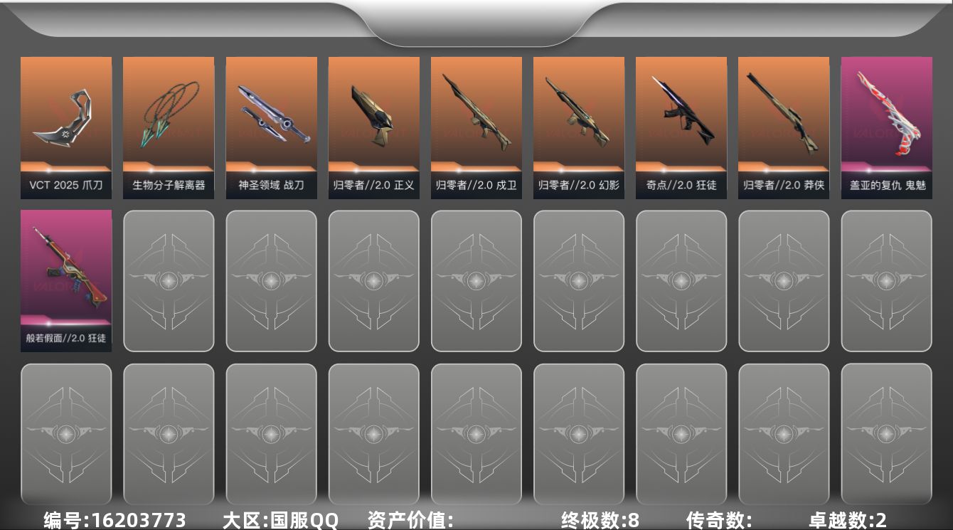 [16203773]【套装】:VCT 2025 赛季套装,归零者//2.0套装 【英雄】:幻棱,炼狱,维斯,暮蝶,钛狐,壹决,铁臂,捷风,雷兹,幽影,不死鸟,贤者,猎枭,芮娜,奇乐,尚勃勒,霓虹,斯凯,星礈,海神,盖可,黑梦,钢锁 【近战武器】:近战武器-VCT 2025 爪刀,近战武器-生物分子解离器,近战武器-神圣领域 战刀 【狂徒】:狂徒-奇点//2.0,狂徒-般若假面//2.0 【幻影】:幻影-归零者//2.0,幻影-神圣领域 【戍卫】:戍卫-归零者//2.0,戍卫-月球哨兵 【獠犬】:獠犬-神圣领域 【冥驹】:冥驹-星云暗涌 【莽侠】:莽侠-归零者//2.0,莽侠-月球哨兵 【战神】:战神-神圣领域 【雄鹿】:雄鹿-月球哨兵 【骇灵】:骇灵-星云暗涌 【蜂刺】:蜂刺-星云暗涌 【正义】:正义-归零者//2.0,正义-纳米打击,正义-月球哨兵 【鬼魅】:鬼魅-盖亚的复仇,鬼魅-诡秘蛇影,鬼魅-星云暗涌 【狂怒】:狂怒-神圣领域 【卡面】:终章:激斗汉堡 卡面,进入射程 卡面,《双城之战》拥抱 卡面,精灵大战 卡面,欢迎来到底城 卡面,南瓜盛典 卡面,无畏契约:暮蝶 卡面,修车达人 卡面,维斯工牌 卡面,正义的化身 卡面,红鳞松叶 卡面,Clutch 卡面,梦幻奶茶 卡面,哨卫者之领域 卡面,零点嗅探设计图 卡面,无畏契约GO!第一卷:芮娜 卡面,无畏契约GO!第一卷:零 卡面,纪念照 P2 卡面,代号红色 卡面,新兵报到 卡面,V契约 卡面,无畏契约 卡面,#拯救宽体奇乐 卡面 【喷漆】:嗨宝南瓜灯 喷漆,嘭! 喷漆,都算到了 喷漆,控场勿近 喷漆,伤心心 喷漆,小丑猫 喷漆,熊抱 喷漆,又被闪了 喷漆,超级粉丝 喷漆,捷风差距 喷漆,禁止喷漆 喷漆,买装还是存钱 喷漆,该转点了 喷漆,胜利属于无畏契约 喷漆,GLHF 喷漆,无畏契约 喷漆 【挂饰】:终章:猫猫木乃伊 挂饰,悠闲鸡块 挂饰,伞绳 挂饰,《双城之战》小蛋糕 挂饰,第九季//第三幕 纪念币 挂饰,无畏契约GO!第一卷 芮娜 挂饰,无畏契约GO!第一卷 零 挂饰,第九季//第二幕 纪念币 挂饰,薰衣草之心 挂饰,袖珍捷风 挂饰,第九季//第一幕 纪念币 挂饰,天外飞客 挂饰,无畏契约 纪念币 挂饰