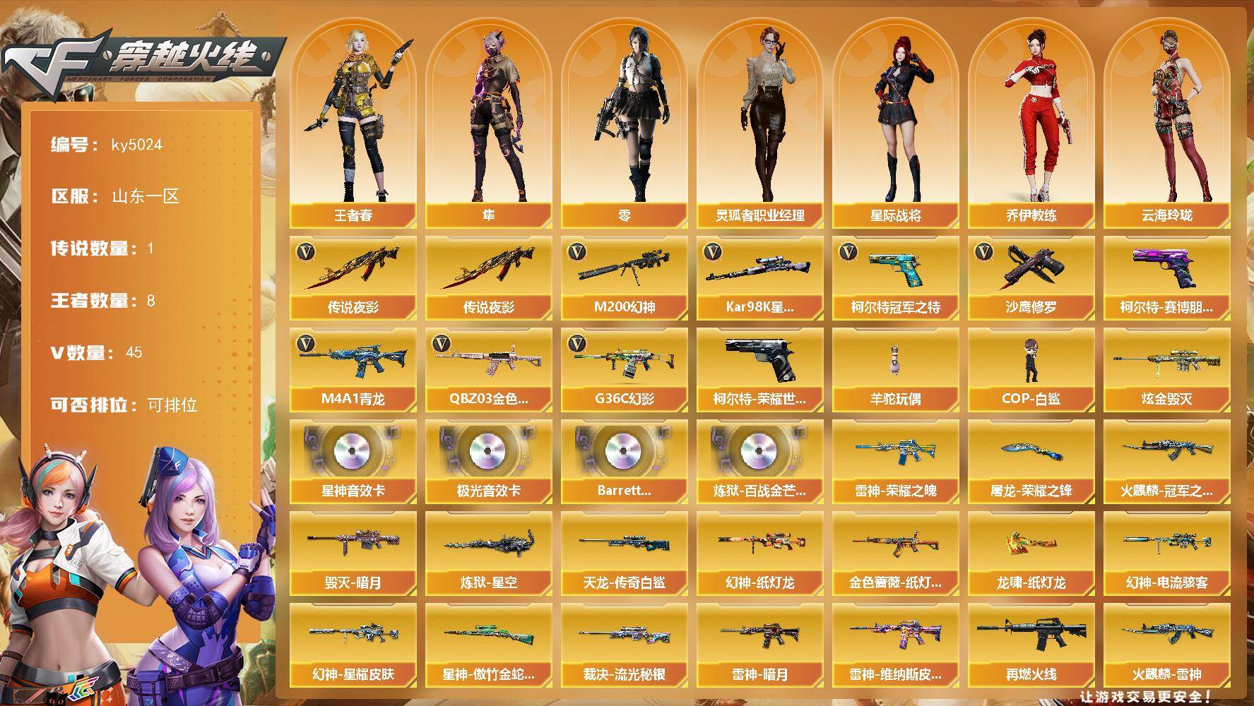 [16204154]山东一区-45V-8王者-1炫金 【传说武器】:传说夜影 【热门武器】:传说夜影,G36C-幻影,QBZ03-金色蔷薇,M4A1-青龙,M200-幻神,柯尔特-荣耀世冠白鲨2023,柯尔特-冠军之特,Kar98K-星神,羊驼玩偶*3,COP-白鲨*2,沙鹰-修罗,柯尔特-赛博朋克 【王者炫金武器】:炫金毁灭 【音效卡】:Barrett-极光音效卡,Kar98K-星神音效卡,Barrett-碧霄极光音效卡,炼狱-百战金芒-庆典舞曲音效卡 【皮肤】:幻神-星耀 皮肤,幻神-纸灯龙皮肤,幻神-电流骇客 皮肤,金色蔷薇-纸灯龙皮肤,裁决-流光秘银,星神-傲竹金蛇 皮肤,雷神-暗月,雷神-荣耀之魄,雷神-维纳斯皮肤,M4A1-再燃火线,火麒麟-雷神,火麒麟-冠军之心,毁灭-暗月,毁灭-星耀 皮肤,毁灭-英雄计划 皮肤,AWM-天龙-传奇白鲨,炼狱-星空,屠龙-荣耀之锋*2,屠龙-星耀 皮肤,龙啸-纸灯龙皮肤,轻型军用手斧-再燃火线,擎天-傲竹金蛇 皮肤 【角色】:零,隼,星际战将,王者春,乔伊教练,云海玲珑,暗夜-X,风暴女,灵狐-花神,灵狐者-职业经理,玫瑰花神,潘多拉-甜心教官,维纳斯 【人偶武器】:COP-白鲨*2,迷你牛魔王,迷你牛牛 【暴走生化】:超级对讲机 【挑战大师】:激光毁灭者III-白马银枪 【英雄级武器】:AK47-火麒麟,M4A1-雷神,AK12-天启,AN94-超新星,AK47-黑鲨,M4A1-青龙,G36C-幻影,QBZ03-金色蔷薇,烈火-动感闪耀,AWM-天龙,Barrett-毁灭,AWM-裁决,M200-幻神,Kar98K-星神,炼狱-百战金芒,沙鹰-修罗,柯尔特-冠军之特,柯尔特-荣耀世冠白鲨2023,天神-动感闪耀,屠龙*2,龙啸,幻灵之锋*3,屠龙-动感闪耀,麒麟刺-百战金芒,高爆手雷-幻灵,手雷-动感闪耀,手雷-云海游龙,闪光弹-雷暴,烟雾弹-雷暴,烟雾弹-幻灵,M4A1-苍鸣雷神,Barrett-碧霄极光 【道具】:BS战队炫彩背包,CFS限定背包,全能枪王背包,女皇终结者-背包,百战金芒炫彩背包,女皇终结者-魔龙之吻,救世主-黑桃战神,绿色巨人,灵魂忍者,妖姬,迷雾幽灵,夺命之镰,防化服*3,金色流光-枪王排位*2,星辰流光-枪王排位,枪王排位29赛季金色流光,语音特效-盛典烟火,萌萌小葵表情,动感闪耀表情,防弹头盔*3,防弹衣*