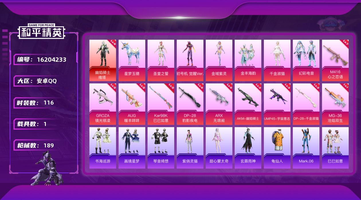 [16204233]【特价出售/店主推荐】安卓 手Q-无敌战神框-1神装-7粉装-11特效枪-1载具-7粉色飞行器-65017热力值-8王牌印记-116套装-189枪皮【红色神装等级】:幽焰骑士-维塔(四级)【红色角色神装】:幽焰骑士-维【热门品类】:套装-龟仙人,角色-Mark.06【粉色套装】:角色-圣堂之誓,角色-初号机 觉醒Ver.,角色-金域紫灵,粉装-金丰海韵,角色-千金淑猫,粉装-幻彩电音,角色-罪夜之【粉色枪皮等级】:AKM-幽焰骑士(三级),M416-心之恋语(七级),GROZA-镜光银凌(五级),AUG-暖羊咩咩(五级),ARX-无垠阁(四级),UMP45-宇宙意志(三级),AKS-74U-森灵之息(五级),Kar98K-巳巳如意(五级),DP-28-千金淑猫(三级),DP-28-豹影疾电(四级),MG-36-沧焰双生(一级)【粉色载具】:星梦玉骢【粉色枪皮】:AKM-幽焰骑士,M416-心之恋语,GROZA-镜光银凌,AUG-暖羊咩咩,ARX-无垠阁,UMP45-宇宙意志,AKS-74U-森灵之息,Kar98K-巳巳如意,DP-28-千金淑猫,DP-28-豹影疾电,MG-36-沧焰双生【粉色飞行器】:龙翔九天飞行器,深渊漩涡飞行器,幽焰列车飞行器,凤舞九天飞行器,万象金身飞行器,极意拳锋飞行器