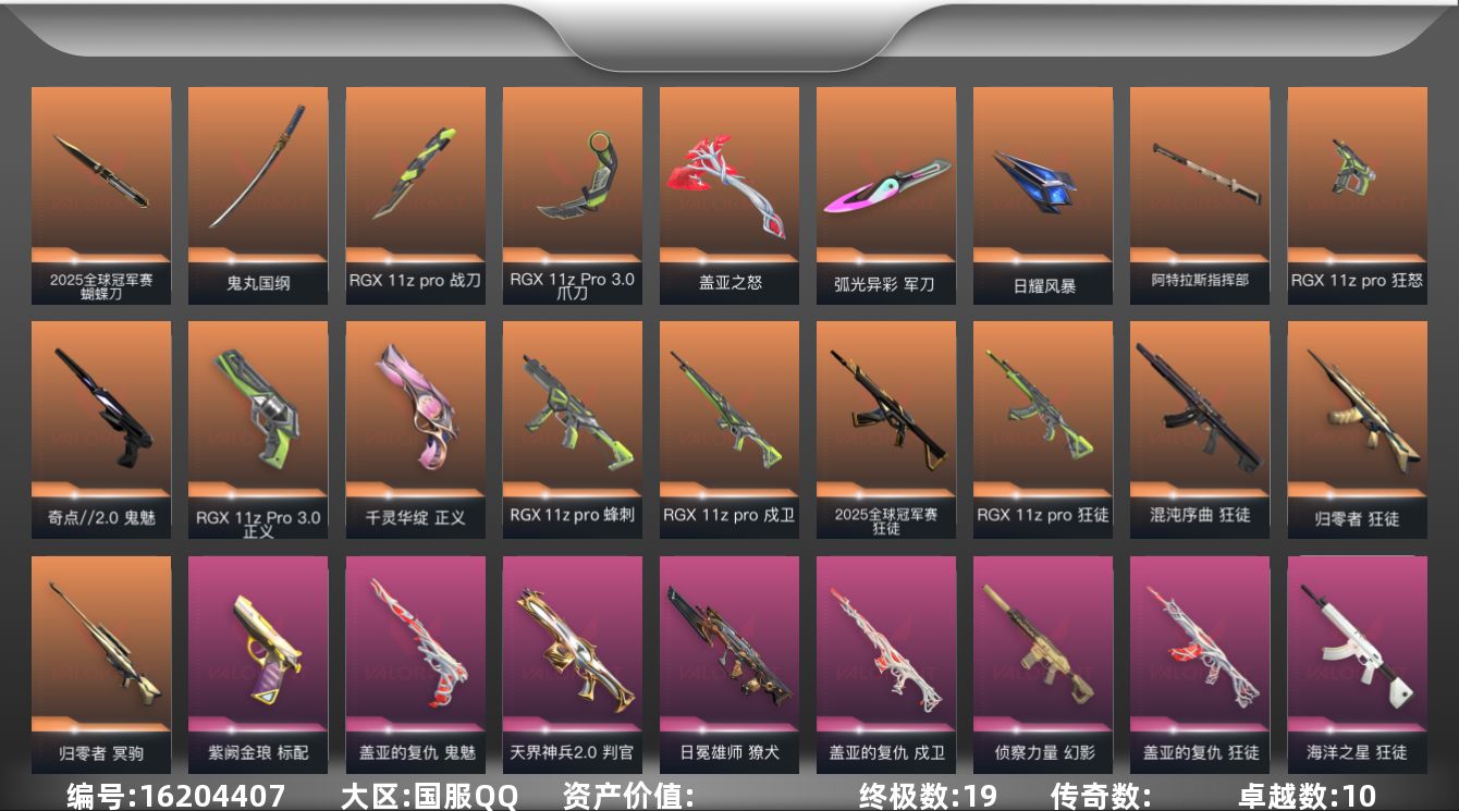 [16204407]【套装】:2025全球冠军赛套装,RGX 11z Pro套装,盖亚的复仇套装 【英雄】:幻棱,炼狱,维斯,暮蝶,钛狐,壹决,铁臂,捷风,雷兹,幽影,不死鸟,贤者,猎枭,蝰蛇,零,芮娜,奇乐,尚勃勒,霓虹,斯凯,夜露,星礈,K/O,海神,盖可,黑梦,钢锁 【近战武器】:近战武器-2025全球冠军赛 蝴蝶刀,近战武器-RGX 11z Pro 战刀,近战武器-RGX 11z Pro//3.0 爪刀,近战武器-鬼丸国纲,近战武器-盖亚之怒,近战武器-弧光异彩 军刀,近战武器-日耀风暴 遗器,近战武器-阿特拉斯指挥部 甩棍 【狂徒】:狂徒-2025全球冠军赛,狂徒-归零者,狂徒-混沌序曲,狂徒-RGX 11z Pro,狂徒-盖亚的复仇,狂徒-海洋之星,狂徒-弧光异彩 【幻影】:幻影-侦察力量,幻影-噬源兽防卫工程 【戍卫】:戍卫-RGX 11z Pro,戍卫-盖亚的复仇,戍卫-彩梦之城 【獠犬】:獠犬-日冕雄师,獠犬-弧光异彩 【冥驹】:冥驹-归零者 【飞将】:飞将-盖亚的复仇,飞将-信手涂鸦 【莽侠】:莽侠-神中神罚 【奥丁】:奥丁-信手涂鸦 【判官】:判官-天界神兵//2.0 【雄鹿】:雄鹿-彩梦之城 【骇灵】:骇灵-信手涂鸦 【蜂刺】:蜂刺-RGX 11z Pro,蜂刺-弧光异彩 【标配】:标配-紫阙金琅,标配-超能偶像,标配-彩梦之城 【正义】:正义-RGX 11z Pro//3.0,正义-千灵华绽,正义-超限闪存,正义-沙尘幻旅,正义-传奇制造,正义-纳米打击 【鬼魅】:鬼魅-奇点//2.0,鬼魅-盖亚的复仇,鬼魅-流星兵团,鬼魅-诡秘蛇影,鬼魅-光导纤维,鬼魅-信手涂鸦 【狂怒】:狂怒-RGX 11z Pro 【短炮】:短炮-弧光异彩,短炮-好搭档 【卡面】:终章:激斗汉堡 卡面,进入射程 卡面,《双城之战》拥抱 卡面,精灵大战 卡面,欢迎来到底城 卡面,南瓜盛典 卡面,修车达人 卡面,正义的化身 卡面,铁之华 卡面,时间到 卡面,最高舞台 卡面,声感陷阱设计图 卡面,梦幻奶茶 卡面,趁热吃 卡面,失控边缘 卡面,源能反应 卡面,零点嗅探设计图 卡面,沙雕爆能器 卡面,无畏契约GO!第一卷:芮娜 卡面,清除名单 卡面,无畏契约GO!第一卷:零 卡面,终章:同步耍酷 卡面,龍记 卡面,化茧成蝶 卡面,无垠星环 卡面,《双城之战》金克丝 卡面,完美调谐 卡面 ,暗枪