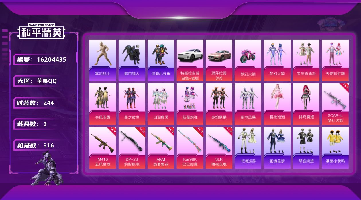 [16204435]【特价出售/店主推荐】苹果 手Q-11粉装-6特效枪-3载具-2粉色飞行器-104201热力值-18王牌印记-244套装-316枪皮【热门品类】:粉装-梦幻火箭,套装-浪漫天命,套装-都市猎人,套装-冥河战士,套装-深海小丑鱼,套装-金羽特工,套装-龟仙人,套装-潮萌小黄鸭,套装-暗影哥特,套装-浪漫波比,套装-粉红小猪,角色-Mark.06【粉色套装】:粉装-宝贝奶油派,粉装-天使彩虹糖,粉装-梦幻火箭,粉装-金风玉露,粉装-星之彼岸,粉装-山涧鹿灵,粉装-蓝莓炮弹,粉装-赤焰黑爵,粉装-紫电风暴,角色-樱桃泡泡,角色-绯穹魔姬【粉色枪皮等级】:AKM-绿萝繁花(五级),SCAR-L-梦幻火箭(七级),M416-五爪金龙(七级),Kar98K-巳巳如意(五级),SLR-暗夜玫瑰(五级),DP-28-豹影疾电(五级)【粉色载具】:特斯拉Model X(珍珠白),玛莎拉蒂Ghibli(粉),双人摩托-梦幻火箭【粉色枪皮】:AKM-绿萝繁花,SCAR-L-梦幻火箭,M416-五爪金龙,Kar98K-巳巳如意,SLR-暗夜玫瑰,DP-28-豹影疾电【粉色飞行器】:梦幻火箭飞行器,神秘黑猫飞行器