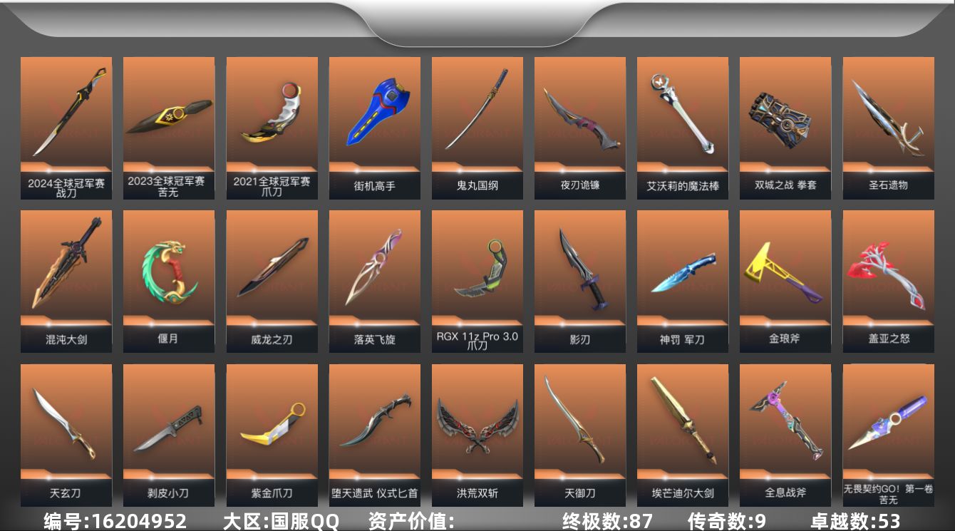 [16204952]【套装】:2024全球冠军赛套装,2023全球冠军赛套装,2021全球冠军赛套装,源能者娱乐系统套装,艾沃莉的梦之翼套装,RGX 11z Pro//3.0套装,混沌序曲套装,离火刃套装,《英雄联盟:双城之战》套装,《双城之战》收藏套装,千灵华绽套装,光明哨兵套装,黯夜怪谈套装,洪荒怒焰套装,全息波普//2.0套装,偃月苍龙套装,VCTxEDG 队伍套装,般若假面//2.0套装,掠影套装,耀鳞威龙套装,紫阙金琅套装,离子武器套装,般若假面套装,天界神兵//2.0套装,奇幻朋克套装,堕天遗武套装,盖亚的复仇套装,海洋之星套装,日冕雄师套装,王牌队员套装,离火刃套装 【英雄】:幻棱,炼狱,维斯,暮蝶,钛狐,壹决,铁臂,捷风,雷兹,幽影,不死鸟,贤者,猎枭,蝰蛇,零,芮娜,奇乐,尚勃勒,霓虹,斯凯,夜露,星礈,K/O,海神,盖可,黑梦,钢锁 【近战 武器】:近战武器-2024全球冠军赛 战刀,近战武器-2023全球冠军赛 苦无,近战武器-2021全球冠军赛 爪刀,近战武器-无畏契约GO!第一卷 苦无,近战武器-剥皮小刀,近战武器-紫金爪刀,近战武器-RGX 11z Pro//3.0 爪刀,近战武器-离火刃,近战武器-落英飞旋,近战武器-艾沃莉的魔法棒,近战武器-威龙之刃,近战武器-鬼丸国纲,近战武器-双城之战 拳套,近战武器-埃芒迪尔大剑,近战武器-离子武器 能量剑,近战武器-珍珠棘贝 短剑,近战武器-混沌大剑,近战武器-般若长牙,近战武器-流星兵团 短剑,近战武器-超能偶像 应援棒,近战武器-超限闪存 匕首,近战武器-堕天遗武 仪式匕首,近战武器-放电尖刺,近战武器-盖亚之怒,近战武器-海星锚,近战武器-合金战车 军刀,近战武器-洪荒双斩,近战武器-弧光异彩 军刀,近战武器-街机高手,近战武器-金琅斧,近战武器-全息战斧,近战武器-赛尔凯特之刃,近战武器-神罚 军刀,近战武器-圣石遗物,近战武器-天玄刀,近战武器-天御刀,近战武器-偃月,近战武器-夜刃诡镰,近战武器-影刃,近战武器-诡秘蛇影 军刀,近战武器-日耀风暴 遗器 【狂徒】:狂徒-艾沃莉的梦之翼,狂徒-2023全球冠军赛,狂徒-2021全球冠军赛,狂徒-光明哨兵,狂徒-归零者,狂徒-洪荒怒焰,狂徒-混沌序曲,狂徒-机动狂飙,狂徒-全息波普//2.0,狂徒-双城之战,狂徒-塑水宗,狂徒-偃月苍龙,狂徒-般若假面/