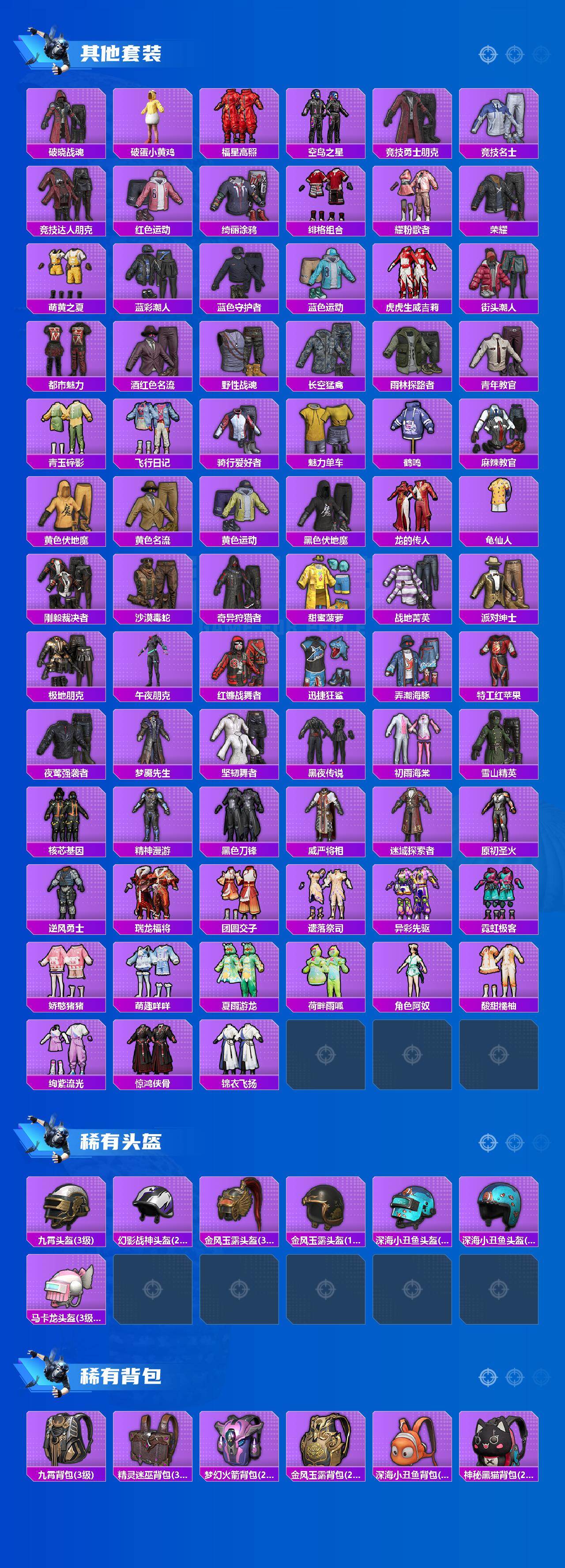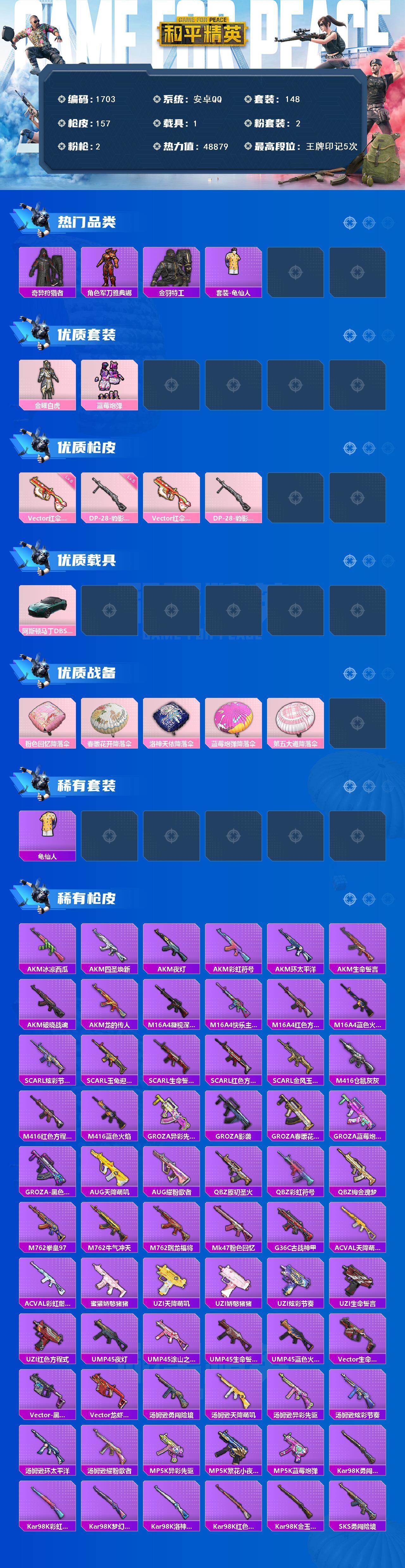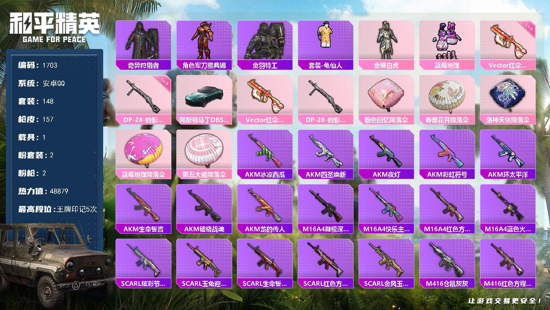 [16205743]【1703】安卓 手Q-2粉装-2特效枪-1载具-0粉色飞行器-48879热力值-5王牌印记-148套装-157枪皮 【热门品类】:套装-奇异狩猎者,角色-军刀雅典娜,套装-金羽特工,套装-龟仙人 【粉色套装】:粉装-金曜白虎,粉装-蓝莓炮弹 【粉色枪皮等级】:Vector-红伞翩翩(六级),DP-28-豹影疾电(五级) 【粉色载具】:阿斯顿马丁DBS(绿) 【粉色枪皮】:Vector-红伞翩翩,DP-28-豹影疾电 【粉色降落伞】:粉色回忆降落伞,春暖花开降落伞,洛神天依降落伞,蓝莓炮弹降落伞,第五大道降落伞 【稀有套装】:套装-龟仙人 【稀有枪皮】:AKM-冰凉西瓜,AKM-四圣焕新,AKM-夜灯,AKM-彩虹符号,AKM-环太平洋,AKM-生命誓言,AKM-破晓战魂,AKM-龙的传人,M16A4-凝视深渊,M16A4-快乐主宰,M16A4-红色方程式,M16A4-蓝色火焰,SCAR-L-炫彩节奏,SCAR-L-玉兔迎春,SCAR-L-生命誓言,SCAR-L-红色方程式,SCAR-L-金风玉露,M416-仓鼠灰灰,M416-红色方程式,M416-蓝色火焰,GROZA-异彩先驱,GROZA-影袭,GROZA-春暖花开,GROZA-蓝莓炮弹,GROZA-黑色刀锋,AUG-天降萌叽,AUG-耀粉歌者,QBZ-原初圣火,QBZ-彩虹符号,QBZ-绚金瑰梦,M762-拳皇97,M762-牛气冲天,M762-瑞龙福将,Mk47-粉色回忆,G36C-古战神甲,AC-VAL-天降萌叽,AC-VAL-彩虹甜喵,蜜獾-娇憨猪猪,UZI-天降萌叽,UZI-娇憨猪猪,UZI-炫彩节奏,UZI-生命誓言,UZI-红色方程式,UMP45-夜灯,UMP45-涂山之恋,UMP45-生命誓言,UMP45-蓝色火焰,Vector-生命誓言,Vector-黑色刀锋,Vector-龙虾霸霸,汤姆逊-勇闯险境,汤姆逊-天降萌叽,汤姆逊-异彩先驱,汤姆逊-炫彩节奏,汤姆逊-环太平洋,汤姆逊-耀粉歌者,MP5K-异彩先驱,MP5K-繁花小夜曲,MP5K-蓝莓炮弹,Kar98K-勇闯险境,Kar98K-彩虹符号,Kar98K-梦幻火箭,Kar98K-洛神天依,Kar98K-红色方程式,Kar98K-金玉无双,SKS-勇闯险境,SKS-夜灯,VSS-彩虹符号,VSS-黑色刀锋,Mini14-原初圣火,Mini