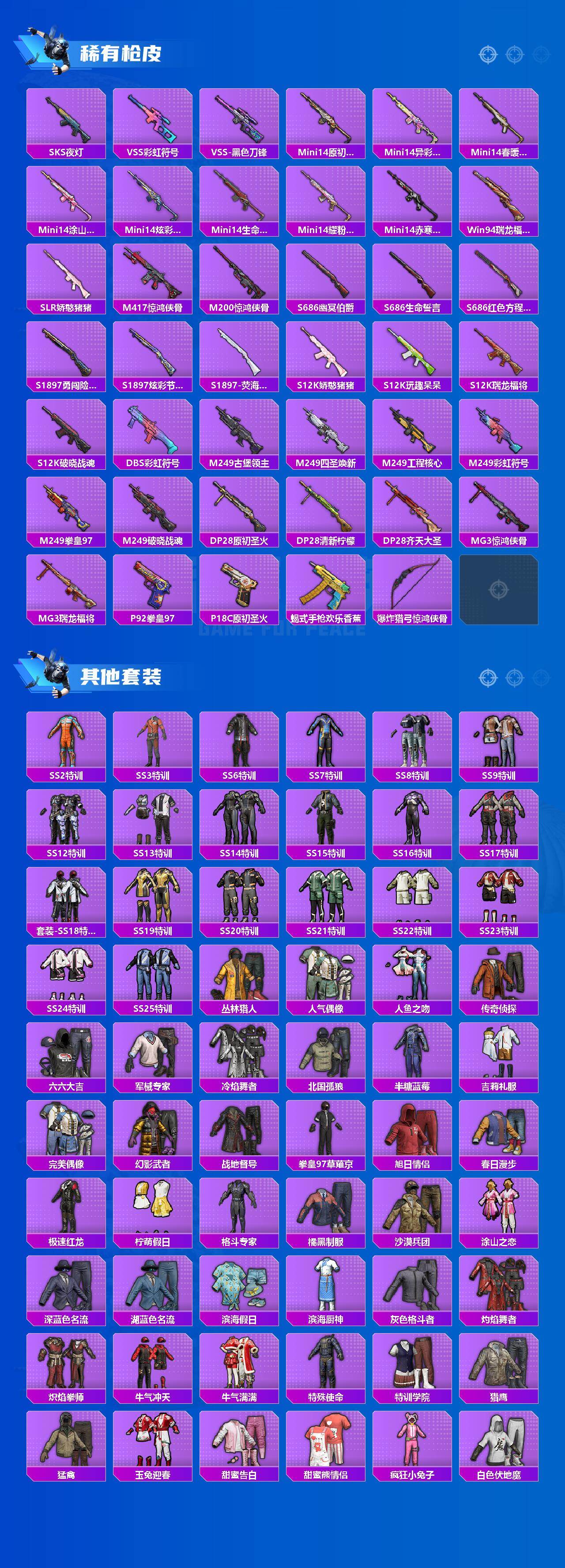 【稀有枪皮】:AKM-冰凉西瓜,AKM-四圣焕新,AKM-夜灯,AKM-彩虹符号,AKM-环太平洋,AKM-生命誓言,AKM-破晓战魂,AKM-龙的传人,M16A4-凝视深渊,M16A4-快乐主宰,M16A4-红色方程式,M16A4-蓝色火焰,SCAR-L-炫彩节奏,SCAR-L-玉兔迎春,SCAR-L-生命誓言,SCAR-L-红色方程式,SCAR-L-金风玉露,M416-仓鼠灰灰,M416-红色方程式,M416-蓝色火焰,GROZA-异彩先驱,GROZA-影袭,GROZA-春暖花开,GROZA-蓝莓炮弹,GROZA-黑色刀锋,AUG-天降萌叽,AUG-耀粉歌者,QBZ-原初圣火,QBZ-彩虹符号,QBZ-绚金瑰梦,M762-拳皇97,M762-牛气冲天,M762-瑞龙福将,Mk47-粉色回忆,G36C-古战神甲,AC-VAL-天降萌叽,AC-VAL-彩虹甜喵,蜜獾-娇憨猪猪,UZI-天降萌叽,UZI-娇憨猪猪,UZI-炫彩节奏,UZI-生命誓言,UZI-红色方程式,UMP45-夜灯,UMP45-涂山之恋,UMP45-生命誓言,UMP45-蓝色火焰,Vector-生命誓言,Vector-黑色刀锋,Vector-龙虾霸霸,汤姆逊-勇闯险境,汤姆逊-天降萌叽,汤姆逊-异彩先驱,汤姆逊-炫彩节奏,汤姆逊-环太平洋,汤姆逊-耀粉歌者,MP5K-异彩先驱,MP5K-繁花小夜曲,MP5K-蓝莓炮弹,Kar98K-勇闯险境,Kar98K-彩虹符号,Kar98K-梦幻火箭,Kar98K-洛神天依,Kar98K-红色方程式,Kar98K-金玉无双,SKS-勇闯险境,SKS-夜灯,VSS-彩虹符号,VSS-黑色刀锋,Mini14-原初圣火,Mini