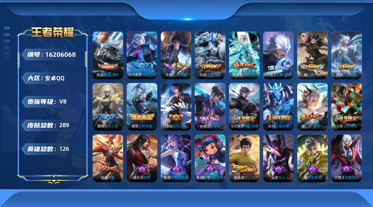 [16206068]安卓Q-V8-永恒钻石IV段位-125英雄-289皮肤-1典藏-0珍品无双-0无双-0珍品传说-10传说-77史诗