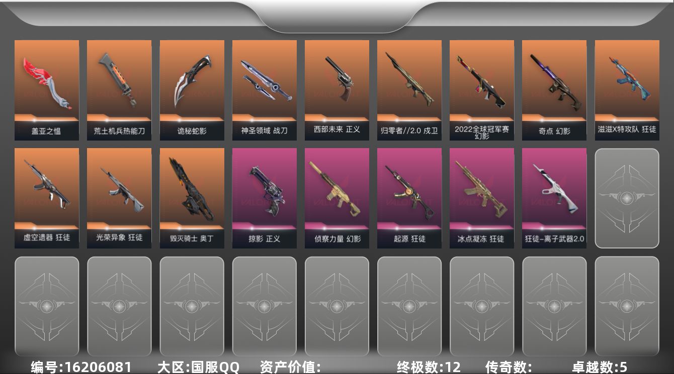 [16206081]【英雄】:幻棱,炼狱,维斯,暮蝶,钛狐,铁臂,捷风,雷兹,幽影,不死鸟,贤者,猎枭,蝰蛇,奇乐,尚勃勒,斯凯,夜露,星礈,K/O,海神,盖可,黑梦,钢锁 【近战 武器】:近战武器-盖亚之愠,近战武器-荒土机兵 热能刀,近战武器-诡秘蛇影 军刀,近战武器-神圣领域 战刀 【狂徒】:狂徒-虚空遗器,狂徒-光荣异象,狂徒-滋滋X特攻队,狂徒-冰点凝冻,狂徒-起源,狂徒-离子武器//2.0,狂徒-荒土机兵,狂徒-诡秘蛇影 【幻影】:幻影-2022全球冠军赛,幻影-奇点,幻影-侦察力量,幻影-神圣领域,幻影-纳米打击,幻影-末日之翼 【戍卫】:戍卫-归零者//2.0,戍卫-逆冲蛮牛,戍卫-月球哨兵,戍卫-折光棱晶 【獠犬】:獠犬-神圣领域,獠犬-逆冲蛮牛 【冥驹】:冥驹-荒土机兵,冥驹-星云暗涌 【飞将】:飞将-末日之翼 【莽侠】:莽侠-诡秘蛇影,莽侠-月球哨兵 【战神】:战神-神圣领域 【奥丁】:奥丁-毁灭骑士,奥丁-纳米打击,奥丁-末日之翼 【判官】:判官-诡秘蛇影,判官-纳米打击x 【雄鹿】:雄鹿-逆冲蛮牛,雄鹿-月球哨兵 【骇灵】:骇灵-荒土机兵,骇灵-星云暗涌 【蜂刺】:蜂刺-星云暗涌,蜂刺-折光棱晶 【标配】:标配-荒土机兵,标配-折光棱晶 【正义】:正义-西部未来,正义-掠影,正义-超限闪存,正义-纳米打击,正义-月球哨兵 【鬼魅】:鬼魅-诡秘蛇影,鬼魅-星云暗涌 【狂怒】:狂怒-神圣领域,狂怒-逆冲蛮牛 【短炮】:短炮-末日之翼 【卡面】:终章:激斗汉堡 卡面,进入射程 卡面,分崩离析 卡面,纳米打击 卡面,抑制技术 卡面,激斗汉堡 卡面,瓦娃脸雪糕 P2 卡面,从黄昏到黎明 卡面,荒土机兵 卡面,银弹猎手 卡面,逆冲蛮牛 卡面,《双城之战》拥抱 卡面,精灵大战 卡面,欢迎来到底城 卡面,南瓜盛典 卡面,修车达人 卡面,正义的化身 卡面,时间到 卡面,最高舞台 卡面,梦幻奶茶 卡面,无畏契约GO!第一卷:芮娜 卡面,无畏契约GO!第一卷:零 卡面,钢锁vs盖可 卡面,胡桃狂想 卡面,代号红色 卡面,新兵报到 卡面,V契约 卡面,无畏契约 卡面 【喷漆】:小小心意 喷漆,战“素”兔 喷漆,宇宙的指引 喷漆,请求重启 喷漆,逆冲蛮牛 喷漆,纳米打击 喷漆,鼻尖上的蝴蝶 喷漆,简笔画黯兽 喷漆,独守蝰腹 喷漆,他们将落荒而逃 喷漆,通缉:战术企鹅 喷漆,荒土机兵