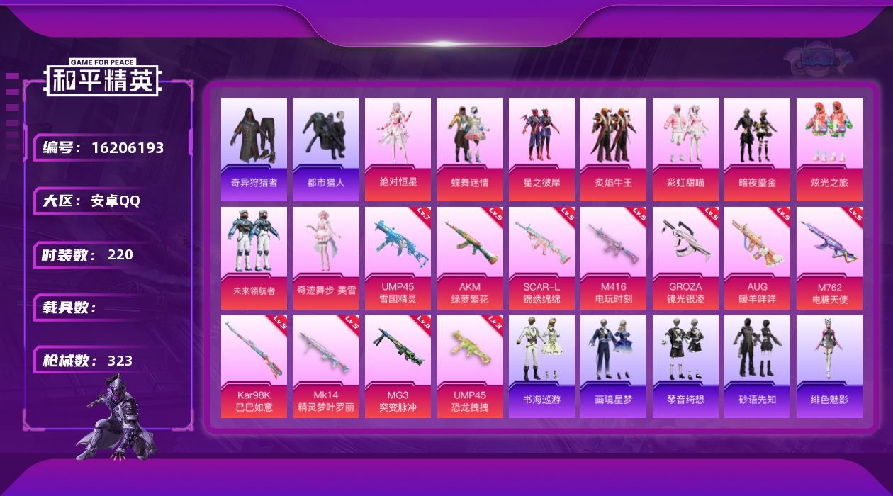 [16206193]【1706】安卓 手Q-9粉装-11特效枪-0载具-4粉色飞行器-97486热力值-17王牌印记-220套装-323枪皮