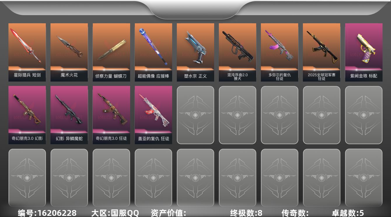 [16206228]【英雄】:炼狱,暮蝶,壹决,铁臂,捷风,不死鸟,贤者,猎枭,芮娜,尚勃勒,霓虹,K/O,盖可 【近战 武器】:近战武器-魔术火花,近战武器-侦察力量 蝴蝶刀,近战武器-超能偶像 应援棒,近战武器-星际猎兵 短剑,近战武器-魔术火花 【狂徒】:狂徒-2025全球冠军赛,狂徒-多弥尔的复仇,狂徒-盖亚的复仇,狂徒-奇幻朋克//3.0,狂徒-超能偶像 【幻影】:幻影-异鳞魔蛇,幻影-奇幻朋克//3.0,幻影-聚合之力 【戍卫】:戍卫-超能偶像 【獠犬】:獠犬-混沌序曲//2.0,獠犬-采蜜小蜂队 【飞将】:飞将-聚合之力 【战神】:战神-采蜜小蜂队 【判官】:判官-超能偶像,判官-采蜜小蜂队 【蜂刺】:蜂刺-聚合之力 【标配】:标配-紫阙金琅,标配-超能偶像 【正义】:正义-塑水宗 【鬼魅】:鬼魅-采蜜小蜂队 【狂怒】:狂怒-聚合之力 【卡面】:终章:生意人麦宝 卡面,铁之华 卡面,失而复得 卡面,时间到 卡面,最高舞台 卡面,复活专家 卡面,归乡 // 蝰蛇 卡面,超能偶像 卡面,生意人麦宝 卡面,音熊登场 卡面,声感陷阱设计图 卡面,Clutch 卡面,钢锁工牌 卡面,战术小伙伴的夏日 卡面,采蜜小蜂队 卡面,聚合之力 卡面,梦幻奶茶 卡面,零点嗅探设计图 卡面,无畏契约GO!第一卷:芮娜 卡面,无畏契约GO!第一卷:零 卡面,无垠星环 卡面,《双城之战》金克丝 卡面,代号红色 卡面,新兵报到 卡面,V契约 卡面,无畏契约 卡面 【喷漆】:又被闪了 喷漆,终极羞辱 喷漆,超级粉丝 喷漆,黯兽卖萌 喷漆,捷风差距 喷漆,惊声尖叫 喷漆,五人成星 喷漆,超能偶像 喷漆,放我出去 喷漆,战术熊的巴拉莱卡琴 喷漆,掩护我 喷漆,大佬发枪 喷漆,边缘试探 喷漆,拼一枪 喷漆,聚合之力 喷漆,采蜜小蜂队 喷漆,梦幻小队 喷漆,五个全都齐了 喷漆,买装还是存钱 喷漆,胜利属于无畏契约 喷漆,GLHF 喷漆,无畏契约 喷漆 【挂饰】:终章:这瓜保熟 挂饰,炼狱雪糕 挂饰,糖葫芦 挂饰,袖珍捷风 挂饰,冲上云霄 挂饰,超能偶像 挂饰,丢麦 挂饰,迷你浓缩 挂饰,尤克里里 挂饰,这瓜保熟 挂饰,采蜜小蜂队 挂饰,第九季//第一幕 纪念币 挂饰,聚合之力 挂饰,第八季//第三幕 纪念币 挂饰,天外飞客 挂饰,《双城之战》魄罗 挂饰,无畏契约 纪念币 挂饰