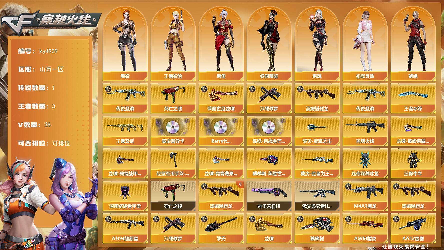 - [16335134]山西一区-39V-3王者-1炫金 【传说角色】:传说星骇 【热门武器】:QBZ03-金色蔷薇,M200-幻神,雷神-小红,沙鹰-修罗 【王者炫金武器】:王者云击,炫金武士 【音效卡】:M4A1-赤狱骑士-怀旧音效卡,Barrett-碧霄极光音效卡 【皮肤】:幻神-青鹤,雷神-暗月 【角色】:王者影豹,雪域霜狐,奇洋探员,乔伊教练,嘉年华灵狐,荆棘玫瑰,灵狐-花神,曼陀罗-礼服,斯沃特-X,游珑儿 【人偶武器】:雷神-小红,AWM-灵狐-15周年嘉年华 【挑战大师】:冰龙粉碎者-白马银枪,激光毁灭者III-白马银枪,神圣爆裂者-末日III 【英雄级武器】:M4A1-黑龙,M4A1-雷神,无影-神兵利器,黑武士-锦绣游龙,超新星-热带奇洋,SCAR Light-玄豹,QBZ03-金色蔷薇,烈火-动感闪耀,M200-幻神,王者凰鸣-觉醒版,沙鹰-修罗,沙鹰-天神,COP 357-云龙*2,USP-冥王,王者之魂-觉醒版,天神-动感闪耀,屠龙-动感闪耀*2,龙啸-热带奇洋,高爆手雷-幻灵*6,手雷-动感闪耀,手雷-热带奇洋,闪光弹-幻灵*7,烟雾弹-幻灵*7,M4A1-赤狱骑士 【道具】:奇洋探员-海龟背包,女皇终结者-背包,热带奇洋炫彩背包,雪域霜狐炫彩背包,女皇终结者-魔龙之吻,救世主-黑桃战神,生化弹匣,夺命之镰,防化服,金色流光-枪王排位*2,星辰流光-枪王排位,枪王排位28赛季金色流光,枪王排位29赛季金色流光,语音特效-怀旧,雪域霜狐表情,热带奇洋表情,动感闪耀表情,防弹头盔*2,防弹衣*2,C4工具钳*2,手雷包*2 【特殊枪械】: