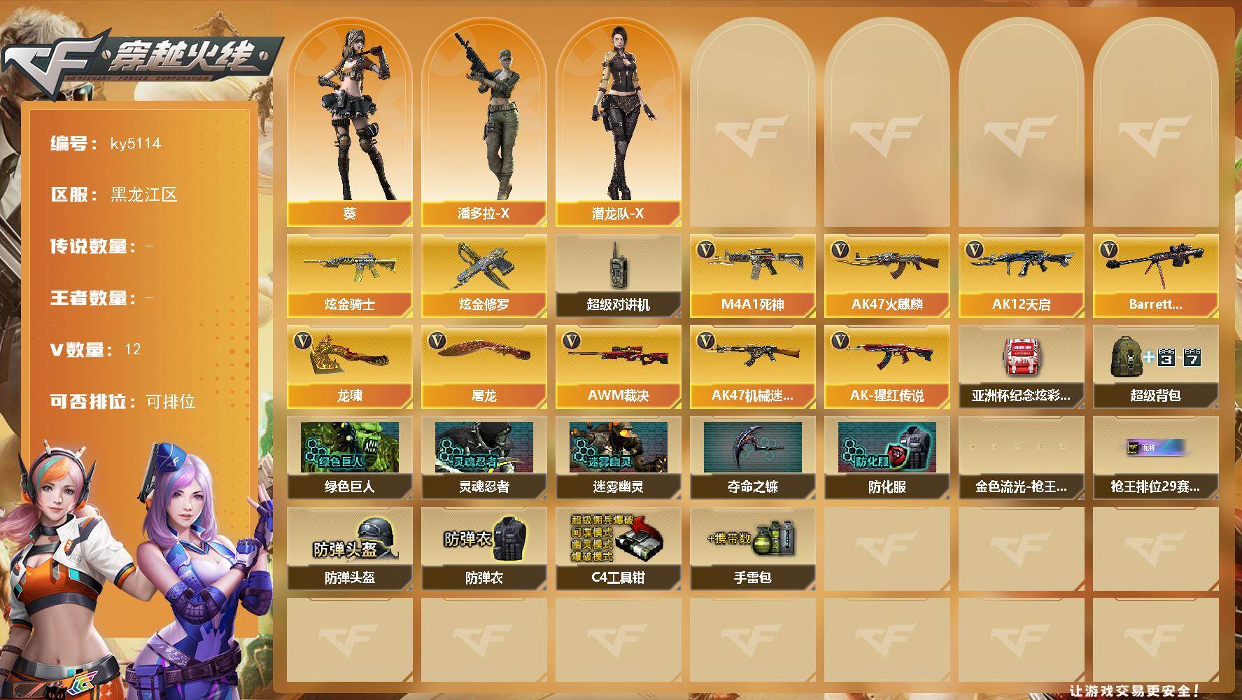 [16207623]黑龙江区-12V-0王者-2炫金 【王者炫金武器】:炫金骑士,炫金修罗 【角色】:葵,潘多拉-X,潜龙队-X 【暴走生化】:超级对讲机 【英雄级武器】:AK47-火麒麟,M4A1-死神,AK12-天启,AK47-机械迷城,AK-47-猩红传说*2,Barrett-毁灭,AWM-裁决,屠龙,龙啸 【道具】:亚洲杯纪念炫彩背包,超级背包,绿色巨人,灵魂忍者,迷雾幽灵,夺命之镰,防化服*2,金色流光-枪王排位,枪王排位29赛季金色流光,防弹头盔*6,防弹衣*6,C4工具钳*2,手雷包*2 【特殊枪械】: