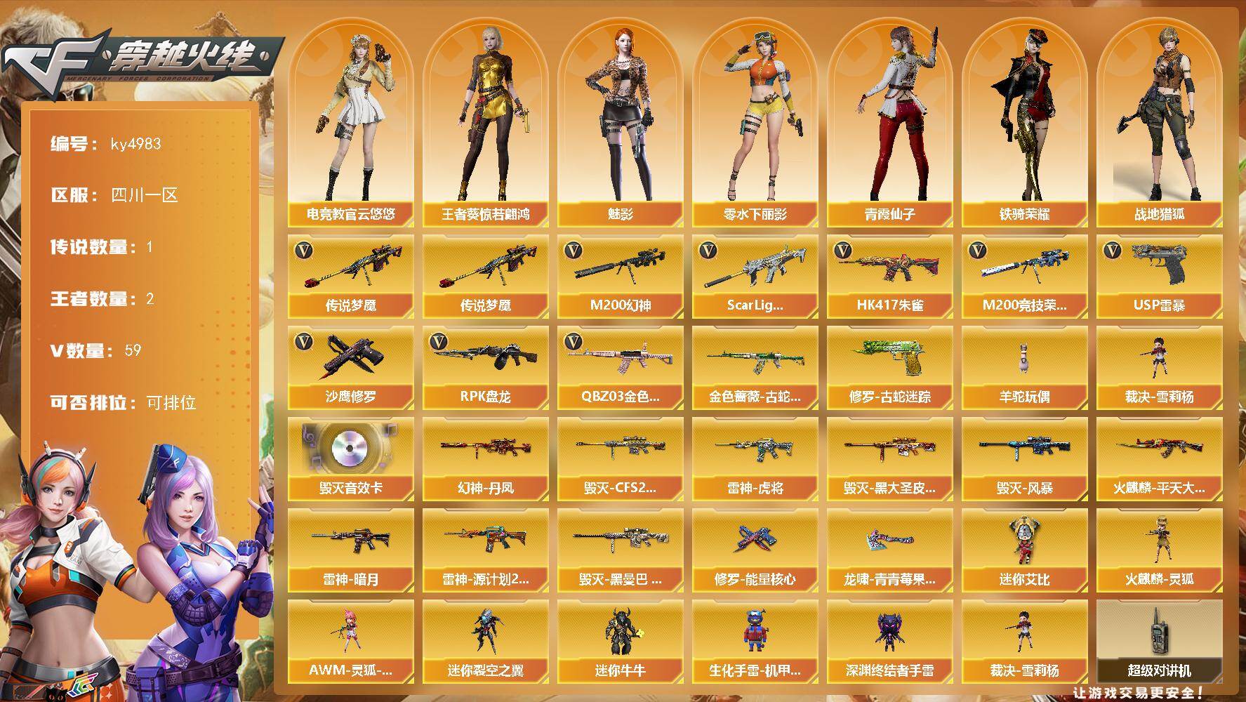 [16208539]四川一区-59V-2王者-0炫金 【传说武器】:传说梦魇 【热门武器】:传说梦魇,QBZ03-金色蔷薇,Scar Light-白虎,HK417-朱雀,M200-幻神,金色蔷薇-古蛇迷踪,修罗-古蛇迷踪,M200-竞技荣光,RPK-盘龙*3,羊驼玩偶,裁决-雪莉杨,USP-雷暴,沙鹰-修罗*4 【音效卡】:Barrett-毁灭音效卡 【皮肤】:幻神-丹凤,雷神-暗月,雷神-虎将,雷神-源计划2.0专属 皮肤,火麒麟-平天大圣,毁灭-CFS2020,毁灭-黑大圣皮肤,毁灭-风暴*2,毁灭-黑曼巴 皮肤,修罗-能量核心,龙啸-青青莓果 皮肤 【角色】:魅影,电竞教官-云悠悠,战地猎狐,王者葵-惊若翩鸿,蛇隐宗,乔伊教练,修道士,云海玲珑,暗夜-X,嘉年华灵狐,0号玩家,零-水下丽影,龙儿,龙儿-小淘气,麻雀,潘多拉-甜心教官,潜龙队-X,青霞仙子,蛇姬,铁骑荣耀,雪莉杨-摸金校尉 【人偶武器】:裁决-雪莉杨,火麒麟-灵狐,AWM-灵狐-15周年嘉年华,迷你裂空之翼*3,迷你牛牛*2,生化手雷-机甲核心*2,深渊终结者手雷,迷你艾比 【暴走生化】:超级对讲机 【英雄级武器】:M4A1-黑龙,M4A1-雷神,HK417-朱雀,Scar Light-白虎,黑武士-锦绣游龙,金色蔷薇-古蛇迷踪,QBZ03-金色蔷薇,王者之烈-觉醒版,Barrett-毁灭,M200-幻神,M200-竞技荣光,RPK-盘龙*3,炼狱-风暴,沙鹰-修罗*4,USP-雷暴,柯尔特-竞技荣光,修罗-古蛇迷踪,龙啸,擎天*2,擎天-竞技荣光*3,王者之锋-觉醒版,高爆手雷-竞技荣光*8,高爆手雷-古蛇迷踪,闪光弹-雷暴,闪光弹-竞技荣光*11,烟雾弹-雷暴,烟雾弹-竞技荣光*9,烟雾弹-古蛇迷踪,M4A1-赤狱骑士,AWM-昌龙 【道具】:CFS限定背包,云山科技背包,亚洲杯纪念炫彩背包,古蛇迷踪炫彩背包,炫彩背包,背包-洛丽塔,超级背包,女皇终结者-魔龙之吻,救世主-黑桃战神,黄金生化钩,绿色巨人,灵魂忍者,变异宝贝,迷雾幽灵,生化弹匣,夺命之镰,防化服*3,金色流光-枪王排位*2,星辰流光-枪王排位,流光-再燃火线,枪王排位28赛季金色流光,枪王排位29赛季金色流光,古蛇迷踪打击特效,蛇隐宗表情,斯沃特表情,EP战队名片,EP战队喷图,EP战队击杀图标,防弹头盔*4,防弹衣*5,C4工具钳*4,手雷包