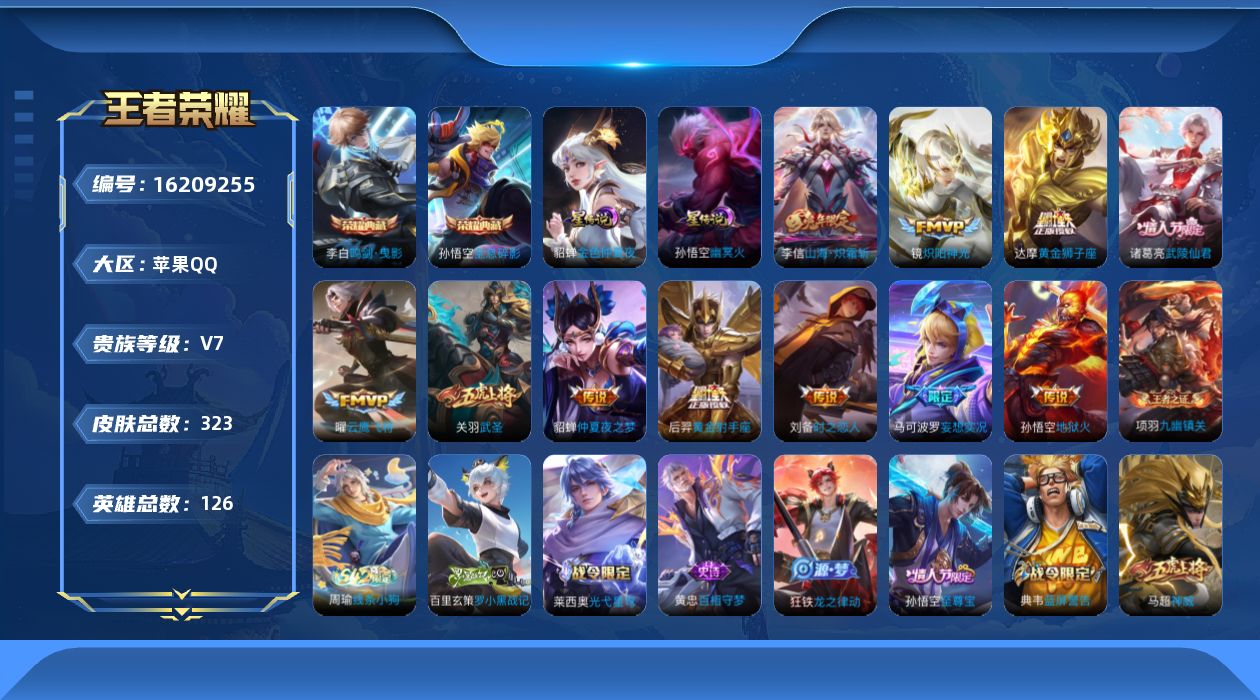 - PX_2095731-贵族等级: V3 英雄数: 81 皮肤数: 34 限定皮: 游园惊梦,至尊宝