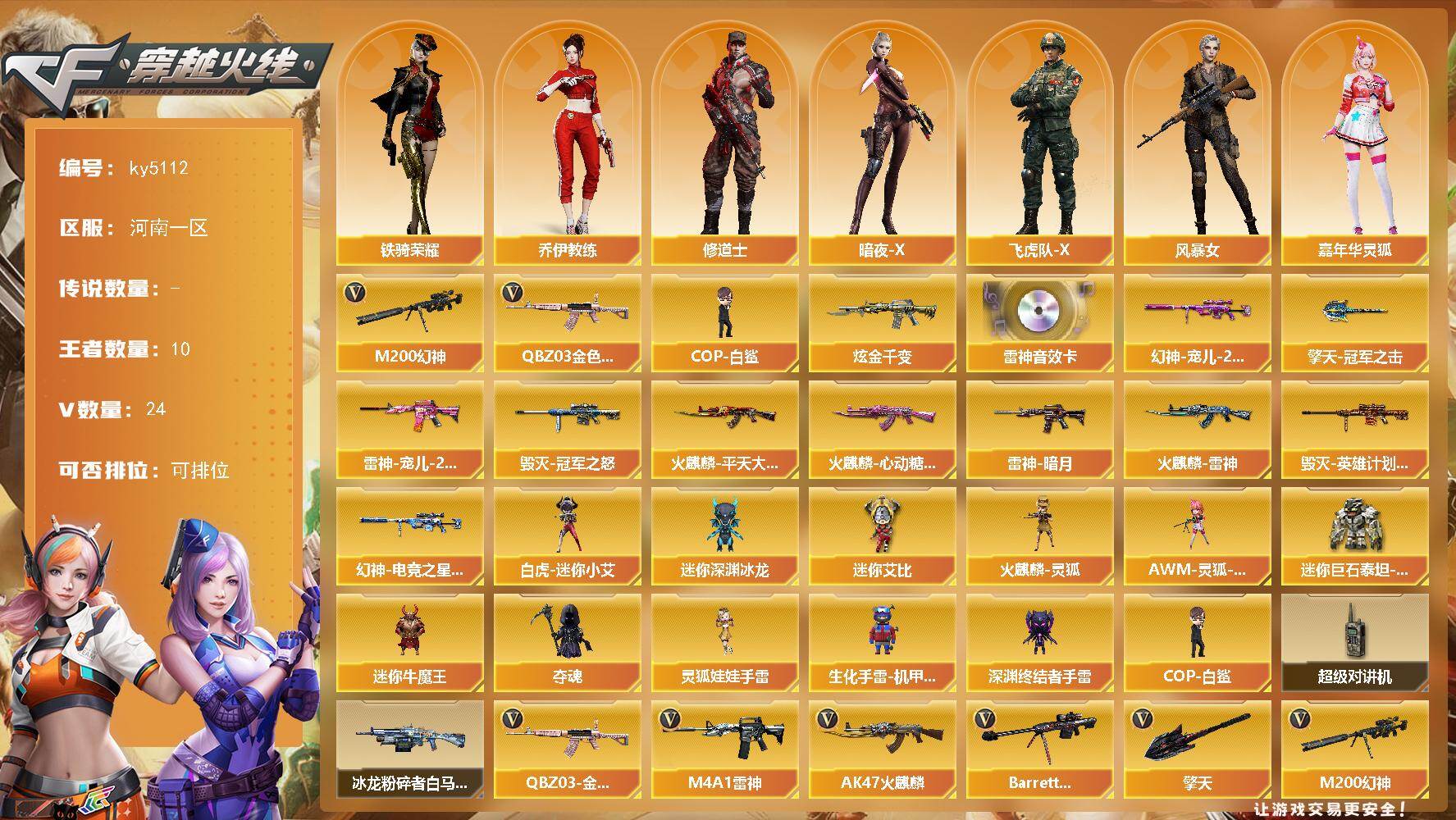 [16209897]河南一区-24V-10王者-1炫金 【热门武器】:QBZ03-金色蔷薇,M200-幻神,COP-白鲨 【王者炫金武器】:炫金千变 【音效卡】:M4A1-雷神音效卡 【皮肤】:幻神-宠儿-2021MVP,幻神-电竞之星 皮肤,雷神-暗月,雷神-宠儿-2019MVP,火麒麟-雷神,火麒麟-平天大圣,火麒麟-心动糖果,毁灭-冠军之怒,毁灭-英雄计划 皮肤,擎天-冠军之击 【角色】:乔伊教练,修道士,暗夜-X,飞虎队-X,风暴女,嘉年华灵狐,娟娟,灵狐者-X,龙儿,潘多拉-X,潘多拉-甜心教官,潜龙队-X,斯沃特-X,铁骑荣耀,樱-战斗天使,影武者-X 【人偶武器】:COP-白鲨,白虎-迷你小艾,火麒麟-灵狐,AWM-灵狐-15周年嘉年华*2,迷你深渊冰龙,迷你牛魔王,夺魂,生化手雷-机甲核心*3,深渊终结者手雷,迷你艾比,迷你巨石泰坦-魔花研究所,灵狐娃娃手雷*2 【暴走生化】:超级对讲机 【挑战大师】:冰龙粉碎者-白马银枪 【英雄级武器】:AK47-火麒麟,M4A1-雷神,无影-神兵利器,黑武士-锦绣游龙,QBZ03-金色蔷薇,烈火-动感闪耀,Barrett-毁灭,M200-幻神,天神-动感闪耀,擎天,幻灵之锋,屠龙-动感闪耀,高爆手雷-幻灵*2,手雷-动感闪耀,闪光弹-幻灵,闪光弹-雷霆王者-觉醒版,烟雾弹-幻灵*2 【道具】:全能枪王背包,炫彩背包,超级背包,哔哩哔哩名片,女皇终结者-魔龙之吻,绿色巨人,灵魂忍者*2,变异宝贝,迷雾幽灵*2,夺命之镰,防化服*3,金色流光-枪王排位*2,星辰流光-枪王排位,枪王排位28赛季金色流光,动感闪耀表情,防弹头盔*3,防弹衣*3,C4工具钳*3,手雷包*3 【特殊枪械】:
