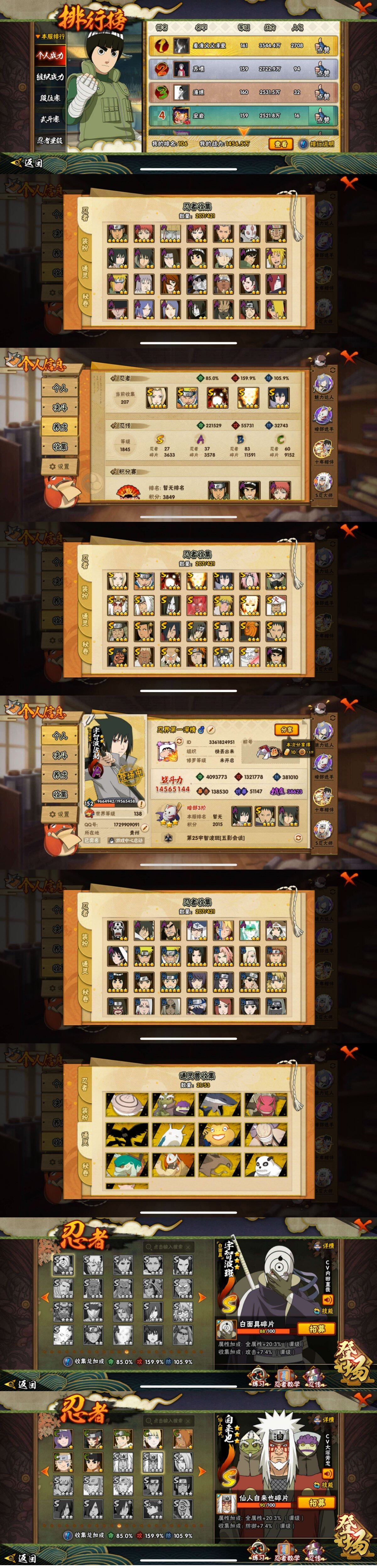 [16211885]27S级忍者数-37A级忍者数 【S级忍者】:猿飞日斩「秽土转生」(3星),宇智波鼬「秽土转生」(3星),宇智波斑「秽土转生·解」(3星),大野木「忍界大战」(3星),春野樱「忍界大战」(3星),宇智波带土「忍界大战」(3星),艾「忍界大战」(3星),宇智波鼬「须佐能乎」(3星),旗木卡卡西「须佐能乎」(3星),千手柱间「木叶创立」(3星),自来也「舞之豪杰」(3星),大蛇丸(3星),自来也「传说中的三忍」(3星),纲手(4星),猿飞日斩(3星),波风水门(3星),神秘面具男「红夜之刃」(3星),漩涡鸣人「九喇嘛连结」(3星),迈特凯「死门」(3星),佩恩「天道」(3星),宇智波佐助「永恒万花筒」(3星),大筒木金式(3星),大筒木桃式(3星),漩涡鸣人「暴怒·第六尾」(3星),波风水门「九喇嘛连结」(3星),宇智波斑「五影会谈」(3星),漩涡鸣人·宇智波佐助(3星) 【A级忍者】:艾「青年」(2星),长门「青年」(2星),波风水门「青年」(2星),波风水门「新春限定」(2星),迪达拉(2星),大蛇丸「晓」(2星),飞段(3星),飞段「死司凭血」(2星),干柿鬼鲛(5星),漩涡博人「桃式显现」(2星),机械鸣人「初始形态」(2星),迈特凯(5星),旗木卡卡西「幻之真容」(2星),桃地再不斩「秽土转生」(2星),我爱罗「疾风传」(3星),蝎(5星),蝎「绯流琥」(2星),小南「新春限定」(2星),小南「漂泊浪客」(2星),猿飞阿斯玛(5星),宇智波鼬(2星),宇智波佐助「须佐能乎」(2星),照美冥「五代目水影」(2星),日向宁次「忍界大战」(2星),宇智波带土「暴怒」(2星),长十郎「六代目水影」(2星),神秘面具男「忍者之路」(2星),佩恩·六道「漂泊浪客」(2星),李洛克「忍界大战」(2星),黑土「夏日限定」(2星),黑土「博人传」(2星),千代「近松十人卫」(2星),神农「羁绊」(2星),不缘(2星),宇智波泉奈(2星),巳月「仙人模式」(2星),迈特凯「青春爆炸」(2星) 【通灵兽】:熊猫