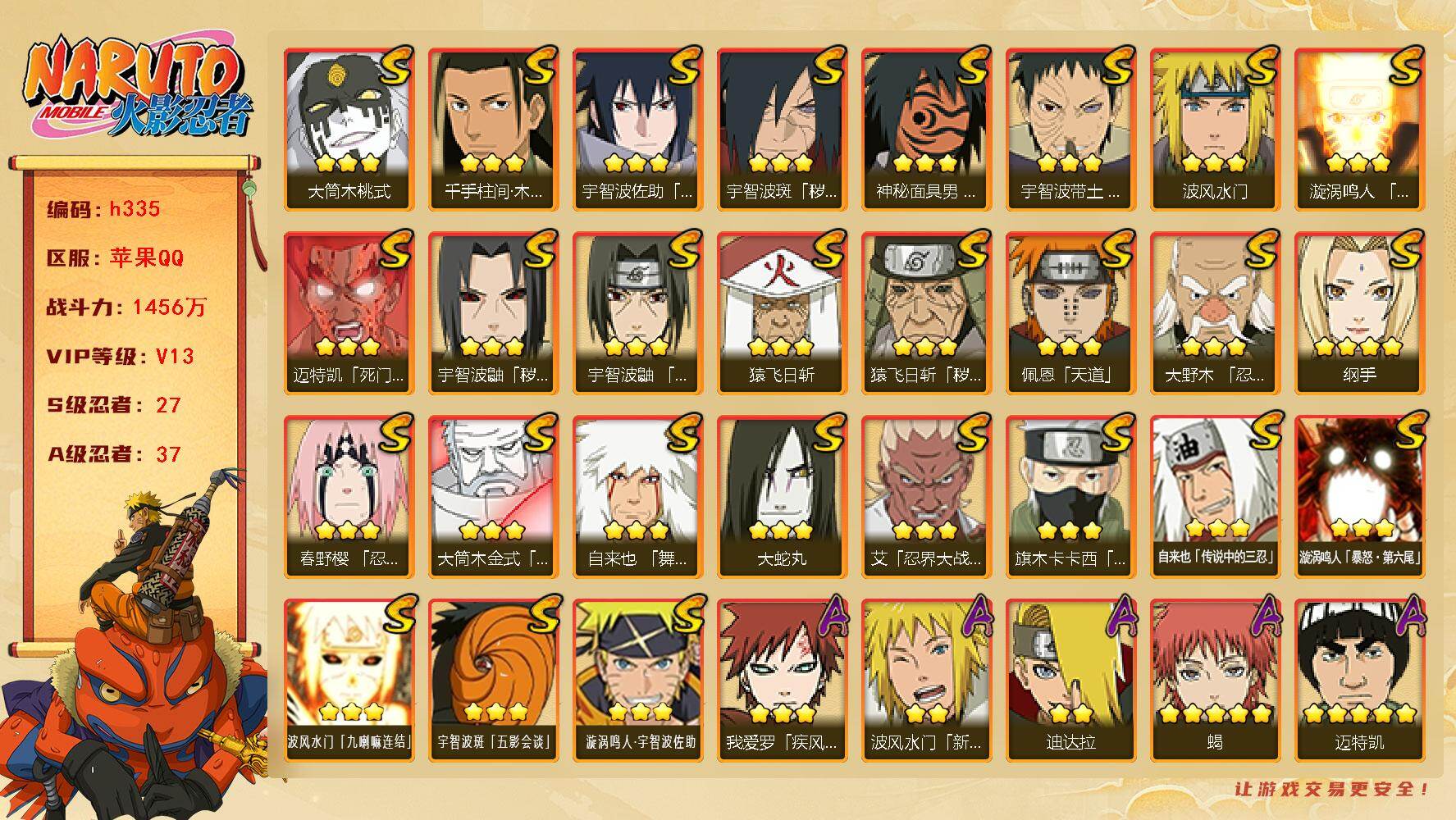 【S级忍者】:猿飞日斩「秽土转生」(3星),宇智波鼬「秽土转生」(3星),宇智波斑「秽土转生·解」(3星),大野木「忍界大战」(3星),春野樱「忍界大战」(3星),宇智波带土「忍界大战」(3星),艾「忍界大战」(3星),宇智波鼬「须佐能乎」(3星),旗木卡卡西「须佐能乎」(3星),千手柱间「木叶创立」(3星),自来也「舞之豪杰」(3星),大蛇丸(3星),自来也「传说中的三忍」(3星),纲手(4星),猿飞日斩(3星),波风水门(3星),神秘面具男「红夜之刃」(3星),漩涡鸣人「九喇嘛连结」(3星),迈特凯「死门」(3星),佩恩「天道」(3星),宇智波佐助「永恒万花筒」(3星),大筒木金式(3星),大筒木桃式(3星),漩涡鸣人「暴怒·第六尾」(3星),波风水门「九喇嘛连结」(3星),宇智波斑「五影会谈」(3星),漩涡鸣人·宇智波佐助(3星)