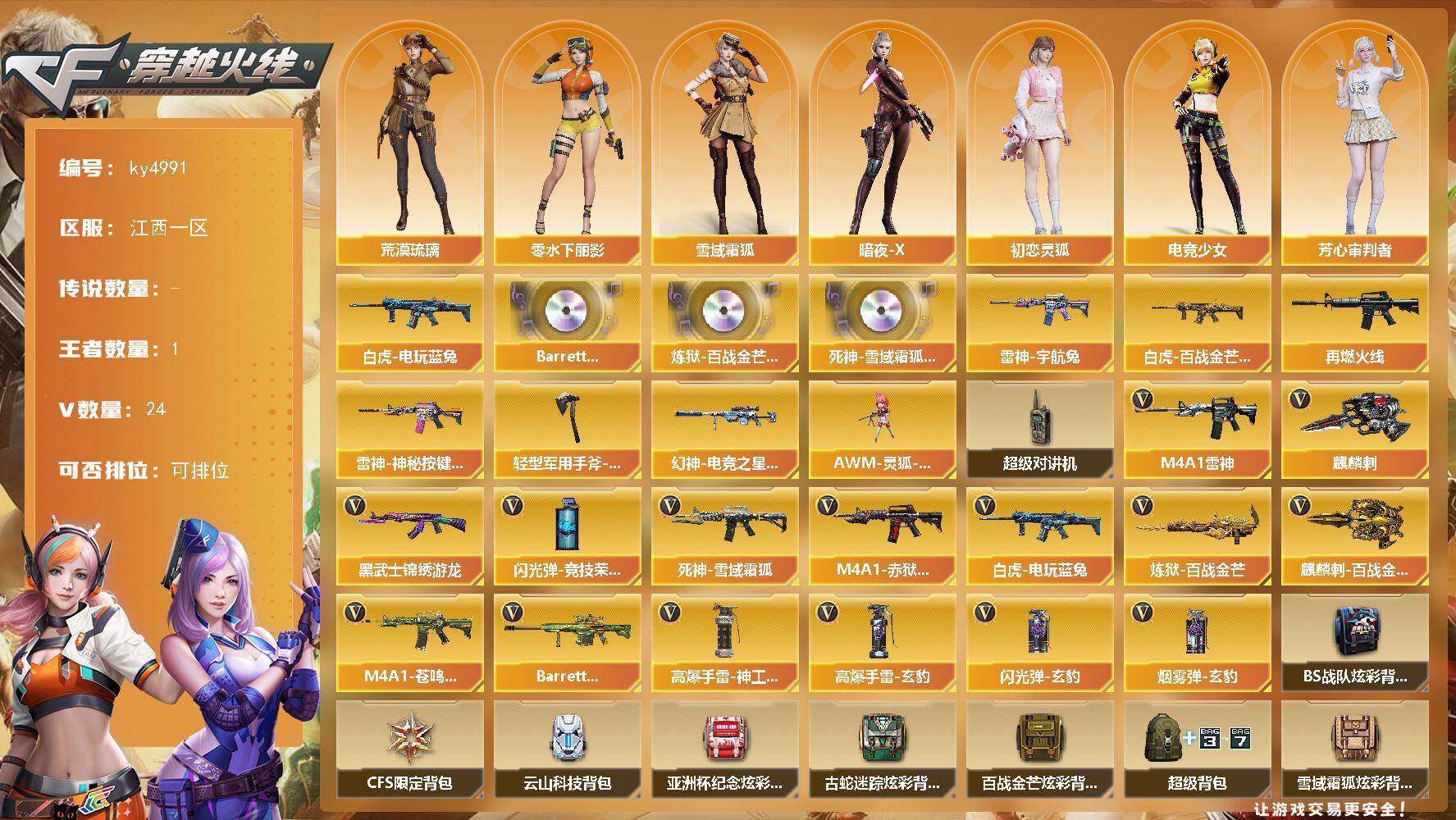 [16212114]江西一区-24V-1王者-0炫金 【热门武器】:白虎-电玩蓝兔 【音效卡】:Barrett-碧霄极光音效卡,炼狱-百战金芒-庆典舞曲音效卡,死神-雪域霜狐-怀旧音效卡 【皮肤】:幻神-电竞之星 皮肤,白虎-百战金芒 皮肤,雷神-宇航兔皮肤,M4A1-再燃火线,雷神-神秘按键 皮肤,轻型军用手斧-再燃火线 【角色】:荒漠琉璃,雪域霜狐,暗夜-X,初恋灵狐,电竞少女,芳心审判者,兰-新年限定,0号玩家,零-水下丽影,灵狐者-X,灵狐者-黄金海岸,潘多拉-甜心教官,蛇姬 【人偶武器】:AWM-灵狐-15周年嘉年华 【暴走生化】:超级对讲机 【英雄级武器】:M4A1-雷神,黑武士-锦绣游龙,死神-雪域霜狐,白虎-电玩蓝兔,炼狱-百战金芒,麒麟刺,麒麟刺-百战金芒,高爆手雷-神工天巧,高爆手雷-玄豹,闪光弹-竞技荣光,闪光弹-玄豹,烟雾弹-玄豹*2,M4A1-赤狱骑士,M4A1-苍鸣雷神,Barrett-碧霄极光 【道具】:BS战队炫彩背包,CFS限定背包,云山科技背包,亚洲杯纪念炫彩背包,古蛇迷踪炫彩背包,百战金芒炫彩背包,超级背包,雪域霜狐炫彩背包,女皇终结者-魔龙之吻,救世主-黑桃战神,黄金生化钩,绿色巨人,灵魂忍者*2,迷雾幽灵,生化弹匣,夺命之镰,防化服*3,枪王排位29赛季金色流光,语音特效-盛典烟火,语音特效-怀旧,雪域霜狐表情,萌萌小葵表情,EP战队击杀图标,防弹头盔,防弹衣,C4工具钳,手雷包 【特殊枪械】: